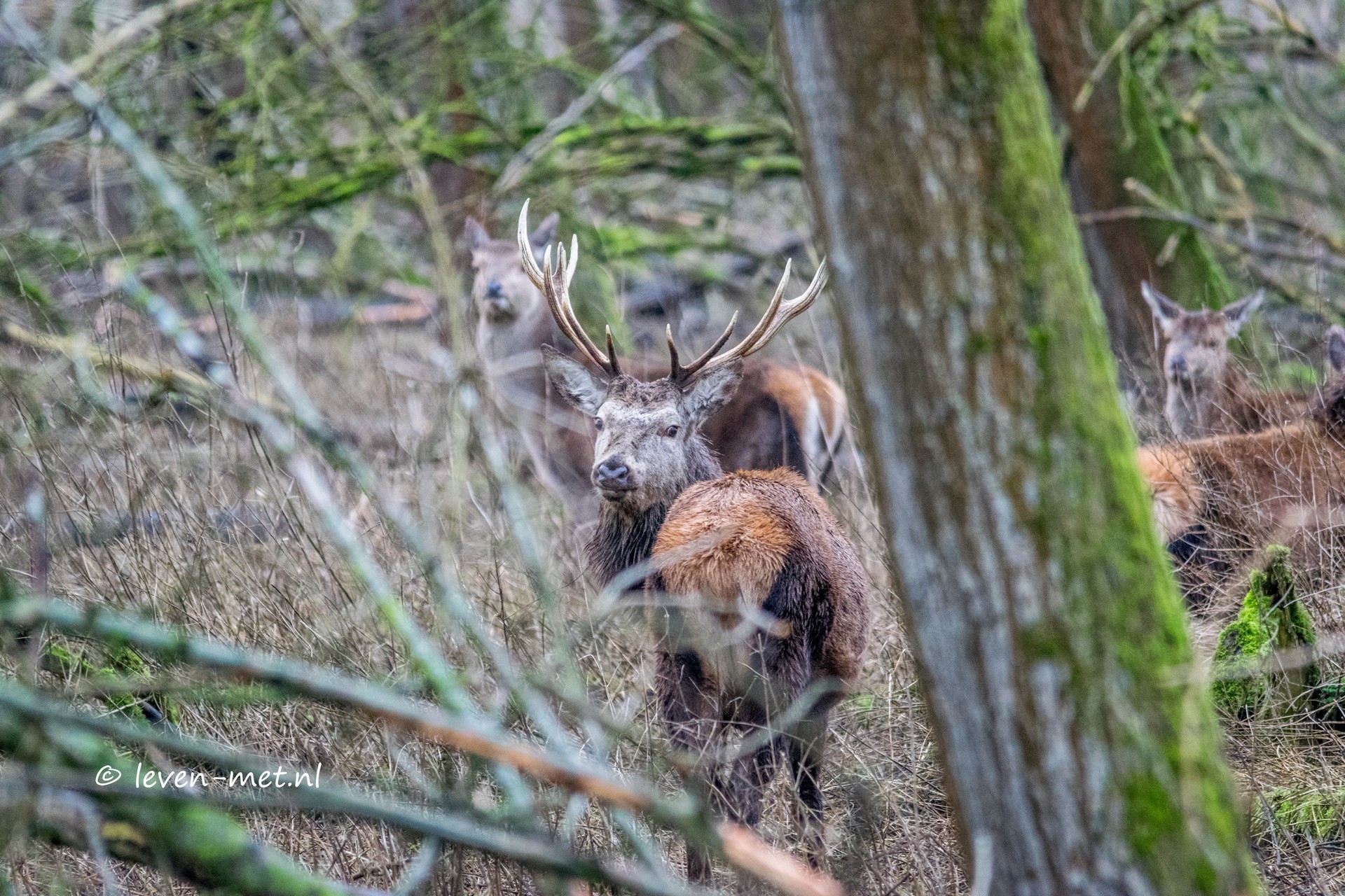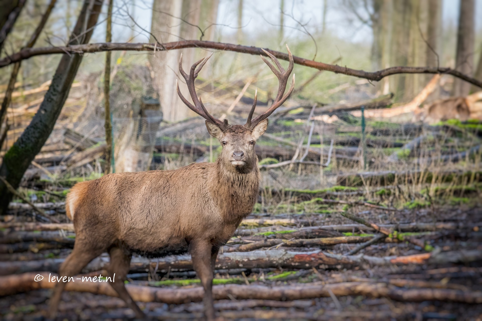 Ik ga nog even langs de Bomenlaan om te kijken of de edelherten er zijn. Maar bij aankomst blijken ze op visite te zijn bij de buren. Ik draai me om en zie wel een prachtig groot Edelhert door de bomen schuiven. Ik hoop dat hij iets verder door loopt, dan komt het edelhert in het open deel van dit stukje bos. En laat daar nou net het zonnetje schijnen. Gelukkig loopt het edelhert op zijn gemak naar het open plekje.