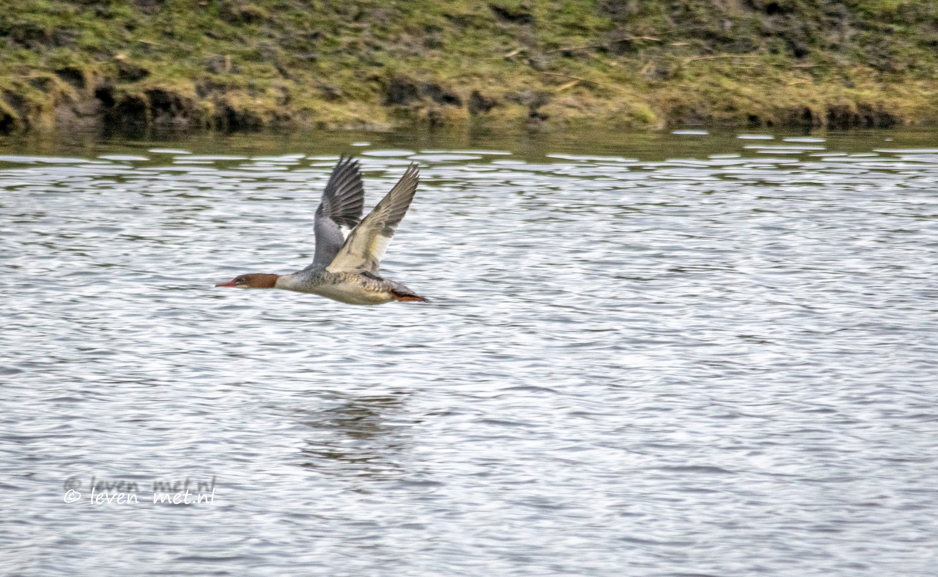 Aangekomen bij het Frans-Vera uitkijkpunt zie ik een grote zaagbek in het water liggen. Snel loop ik naar boven maar probeer me ook een beetje schuil te houden. Als ik de camera klaar heb loop ik verder om hoog en maak ik van af het uitkijkpunt een paar foto’s. En zoals vaker gaat de grote zaagbek er snel van door.