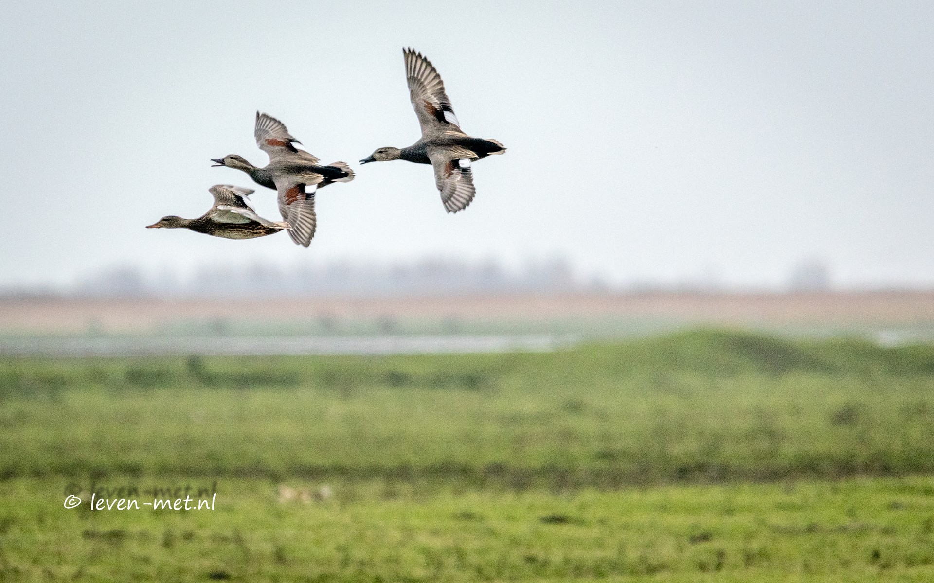 Ik fiets weer naar het begin van het Frans-Vera pad om daar nog even te gaan kijken wat er langs komt vliegen. Niet veel later komen er een paar krakeenden aangevlogen. Wat een stunt vliegers als ze zo achter elkaar aan zitten.