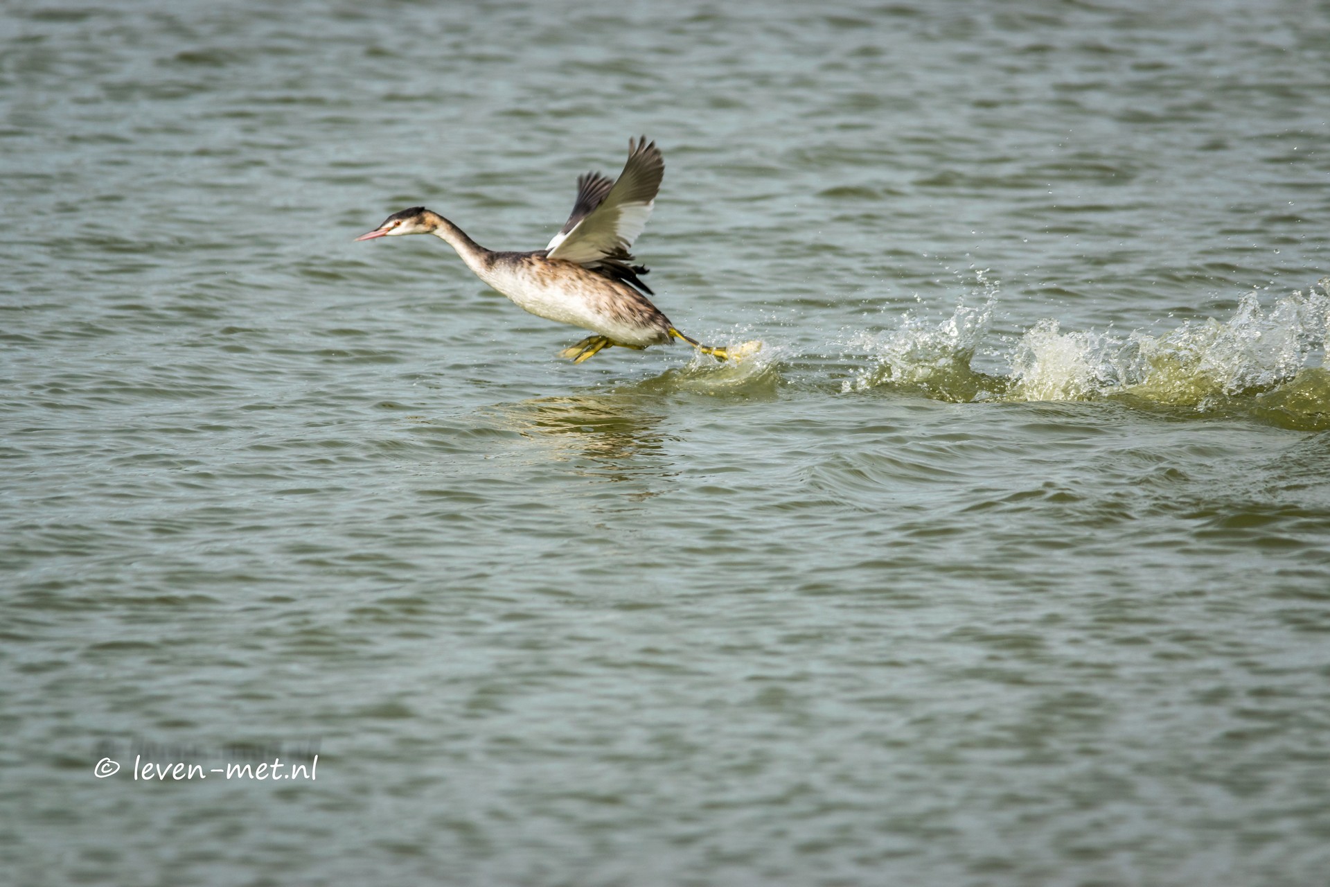 Ik fiets verder de Oostvaardersdijk op en fiets naar de Lepelaarplassen. Boven op de dijk maak ik nog een paar foto’s van twee oude platbodems die ik in de verte zie zeilen. Aangekomen bij de Lepelaarplassen en inmiddels beland in de lepelaarhut. Er liggen veel eenden te dobberen in het water. Een leuke fuut brengt nog een beetje leven in de brouwerij. Aangezien het verder erg stil is.