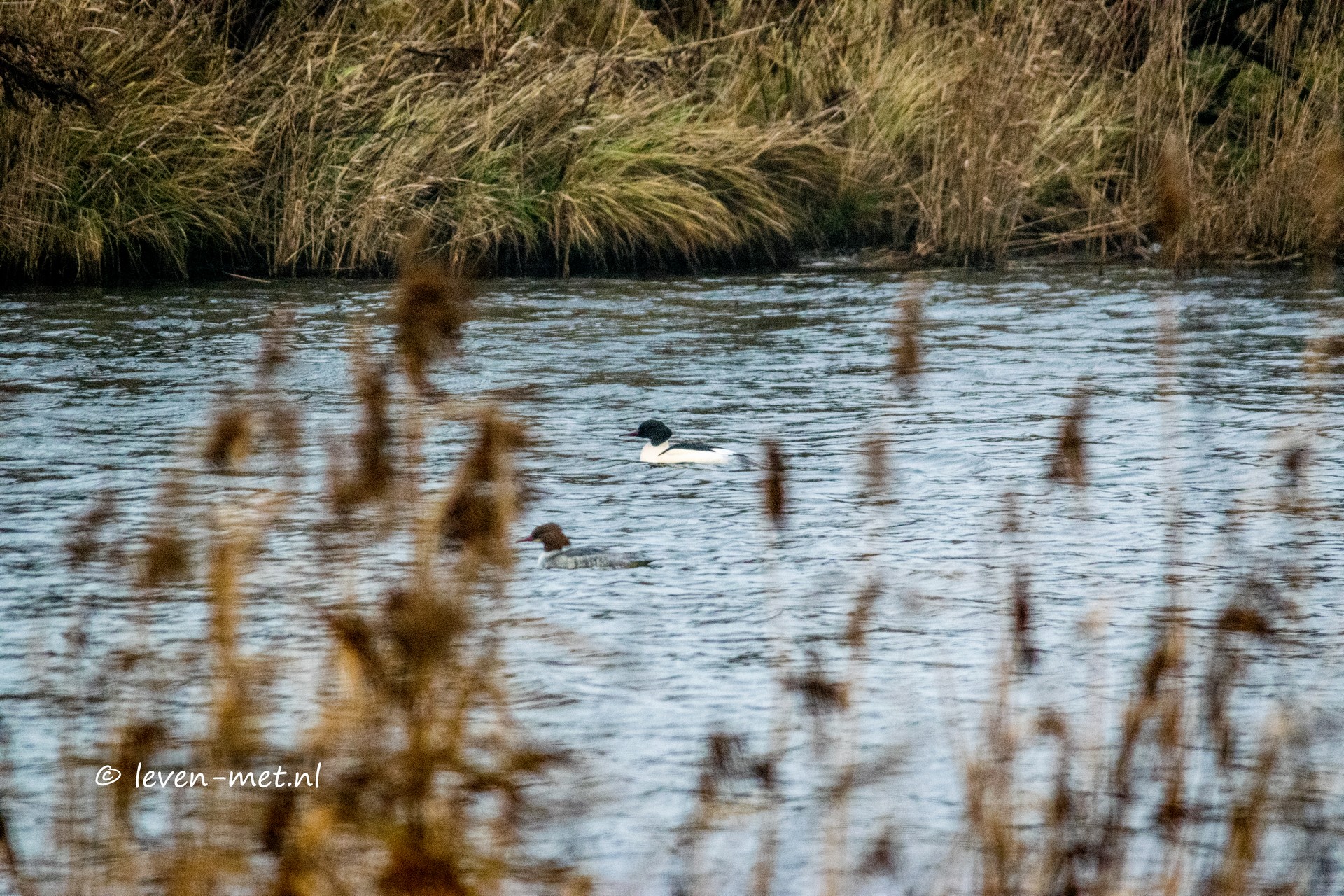 De buizerd is lekker zijn hapje aan het op peuzelen. Ik kan er een mooie serie foto’s van maken. Na de buizerd op de foto gezet te hebben ga ik verder. In de lage-vaart bij de trekweg zie ik een grote zaagbek zwemmen. Ik probeer het vanuit de auto vast te leggen. Maar dat is niet makkelijk met al het riet er voor.