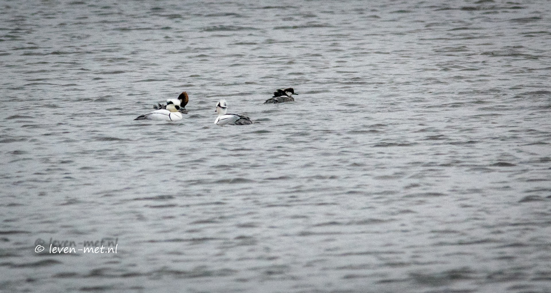 Ik rij weer verder en stop bij de praamweg tegenover de Oeverloperhut. Hier parkeer ik de auto. Ook de auto’s van twee collega spotters zie ik staan. Ik loop nu door het hek en ga via het poelruiterpad naar de poelruiterhut. Aangekomen in de hut zie ik de collega spotters ook zitten. Ik wens Johannes en J-p een gelukkig en gezond 2017 en hierna kletsen we even bij. Na een minuut of vijf moet ik het al voor gezien houden ik krijg veel pijn en heb het koud. Intussen is ook Alex ook een spotter van natuur waarnemers Flevoland de hut binnen komen lopen. We stellen elkaar even voor en ik geef dan aan weer lekker naar de auto te gaan. Johannes gaat ook mee hij was al ruim een uurtje in de hut. Bij de auto spieken we toch nog even bij de oeverloperhut. Ook hier is het helaas heel rustig. In de verte zwemmen wel twee mooie mannetjes nonnetjes.