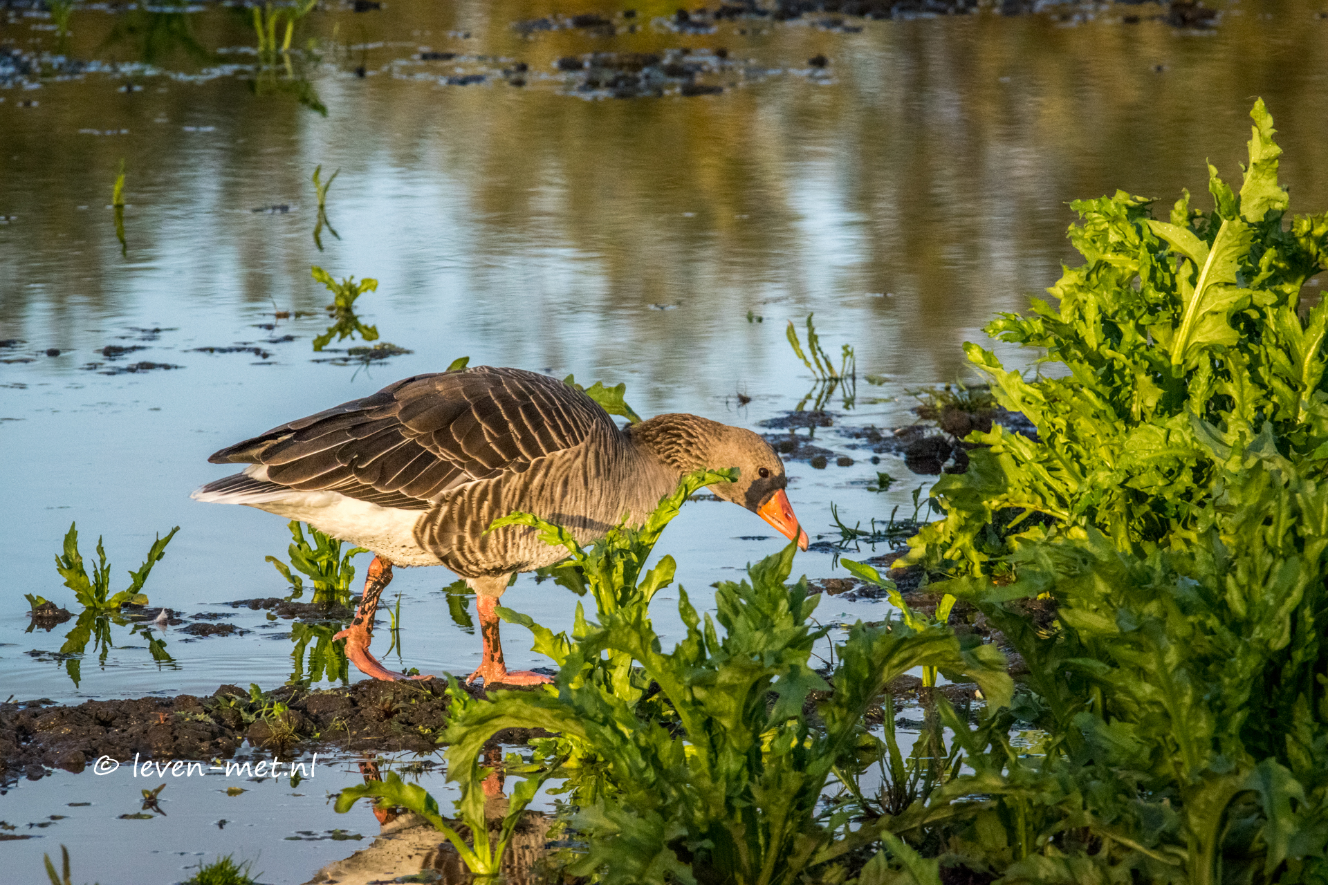 Donderdag ochtend na dat ik mijn hulp-boswachter naar school heb gebracht ga ik even lekker naar het Oostvaardersveld. Aangekomen op de Praamweg parkeer ik de auto en ga eerst even kijken bij de oeverloperhut. Daar staan een paar grauwe ganzen heerlijk hun ontbijt naar binnen te werken.