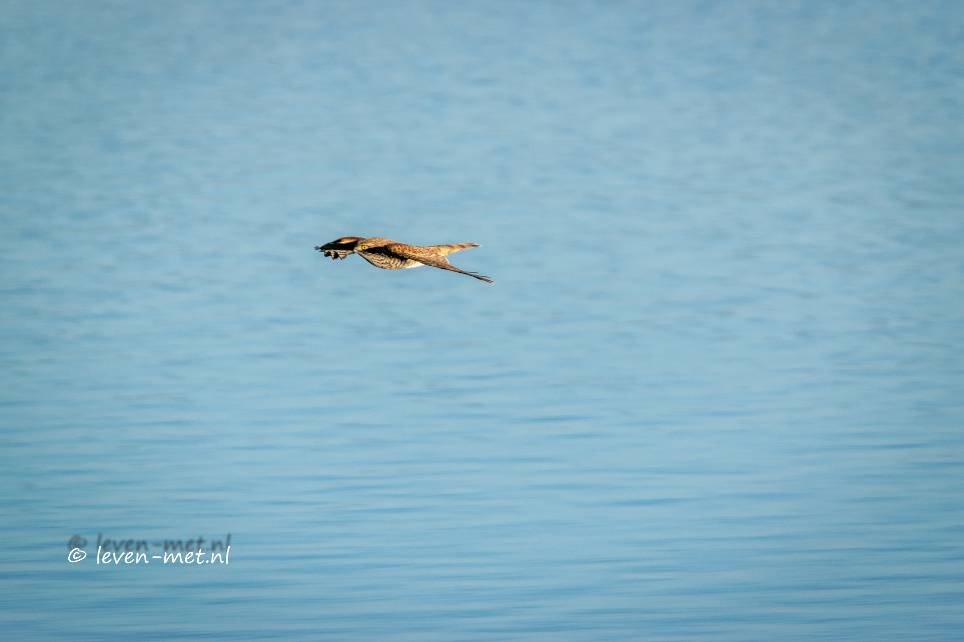 Wauw hebben we zomaar even een sperwer in vlucht te pakken. En zo heb ik ze nog niet vaak gezien zo vlak boven het water. Maar ik heb de sperwer er weer mooi opstaan. Hierna komen de ganzen weer in grote getale binnen vallen.