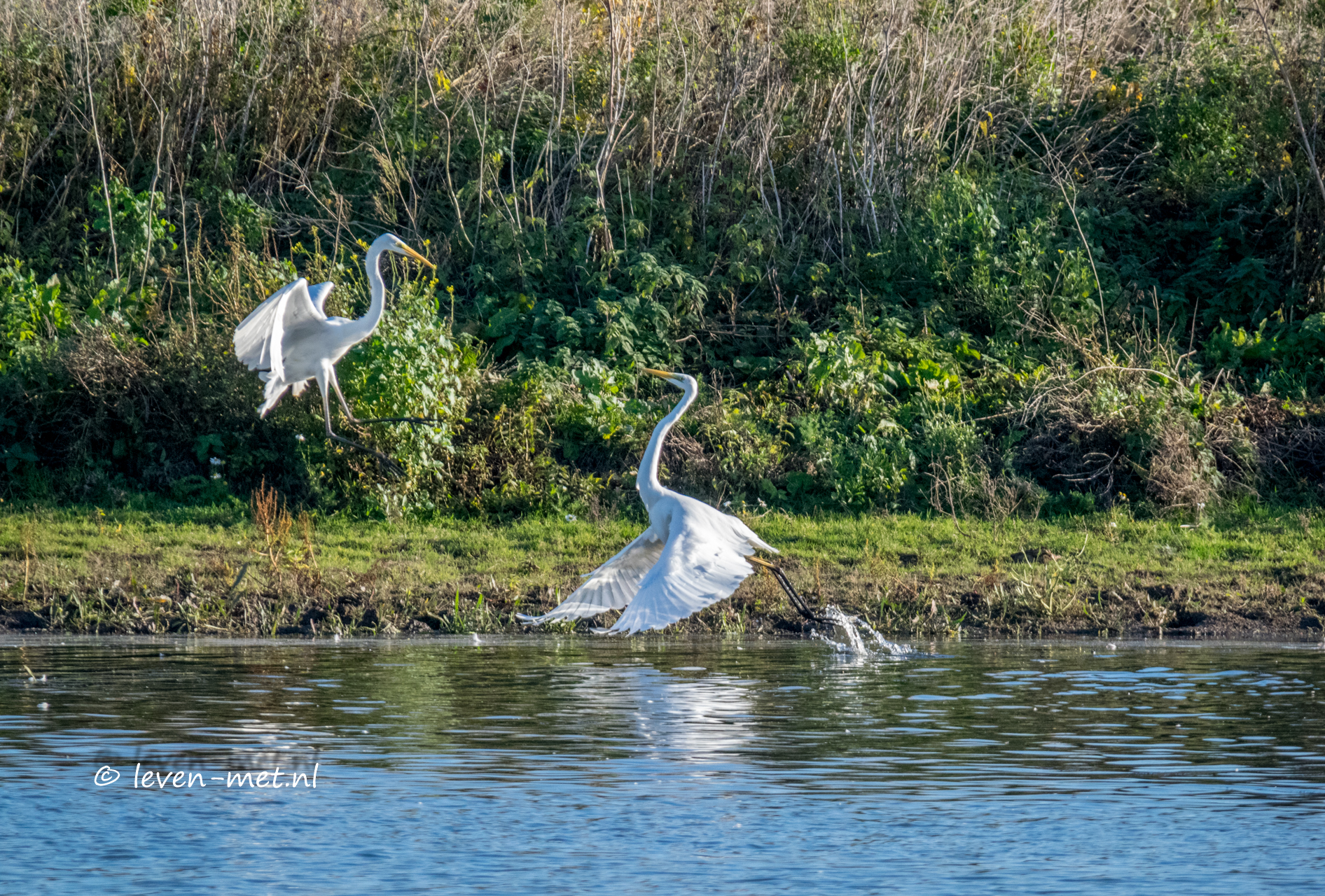 En toch heeft dat wel wat al die ganzen die hun maaltje komen halen in het oostvaardersplassen gebied. Een grote zilverreiger vliegt over het water richting een andere grote zilverreiger. Daniel roept tegen mij dit zou wel eens bekvechten kunnen worden. Dus focus ik de camera op de nog staande grote zilverreiger.