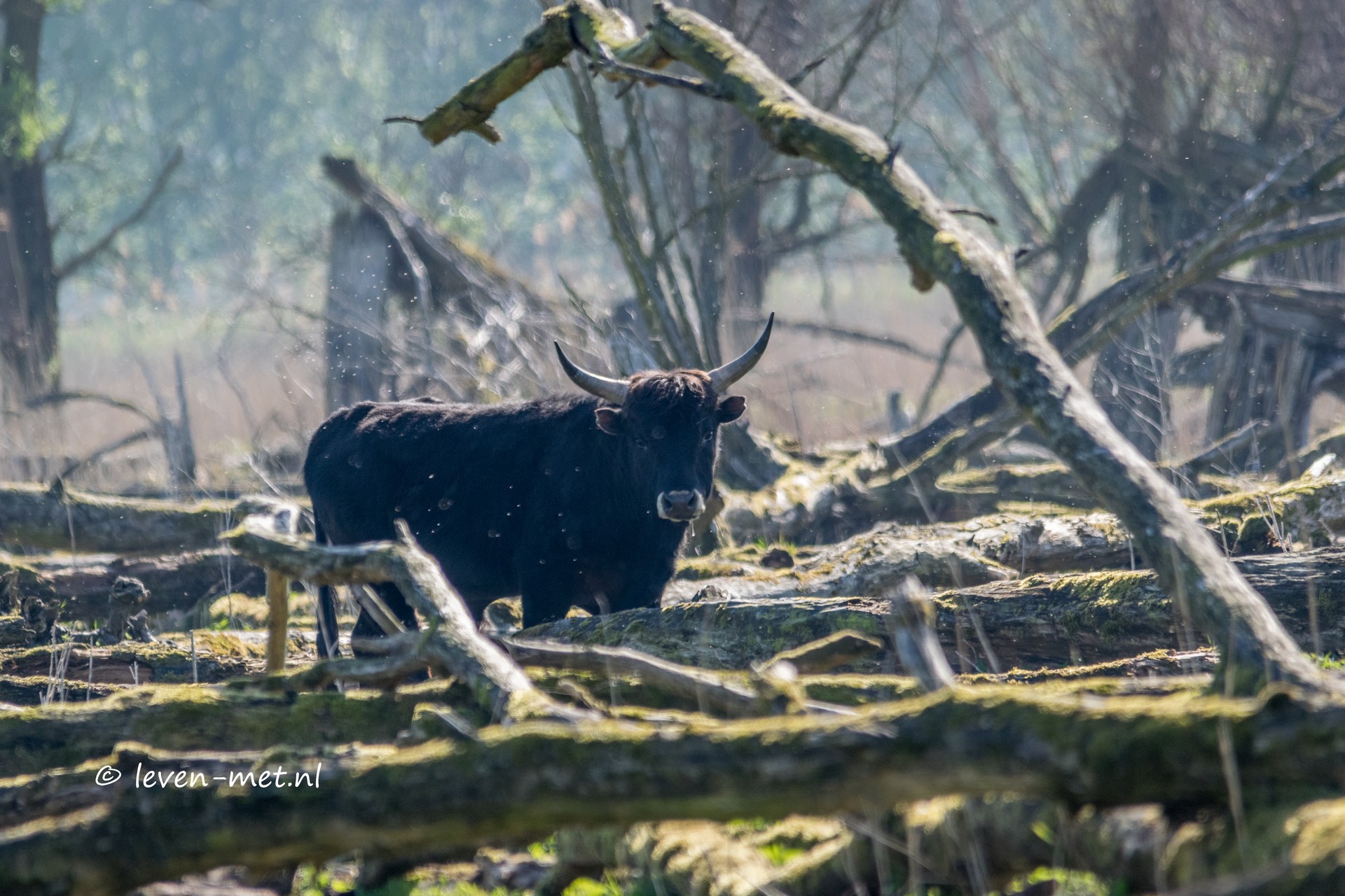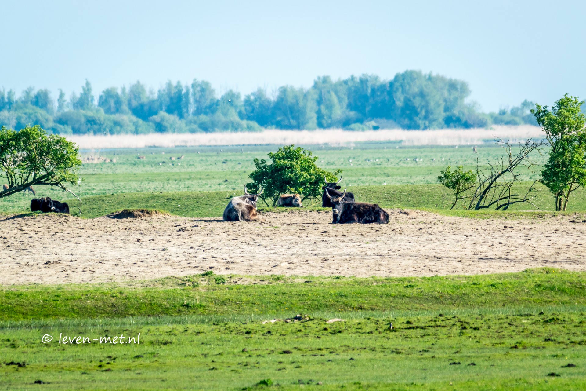 Maandag ochtend, het ziet er lekker uit en ga ik dus lekker op pad. Eerst even de hulp-boswachter naar school brengen en dan via de trekweg en de praam weg naar de Oostvaardersplassen. Eerst stop ik nog even bij de grote praambult en zie daar dat een paar heckrunderen een strand dag hebben.