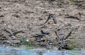 En dat kan ik mooi vast leggen. Na ongeveer twintig minuten verplaatst de groep konikpaarden zich. En zo kan ik dan door het hek heen om naar de krakeendhut te gaan. Aangekomen in de hut is het heel druk aan de rechterzijde. Hier vliegen de huiszwaluwen af en aan om zich op het strandje te goed te doen aan een hapje klei.