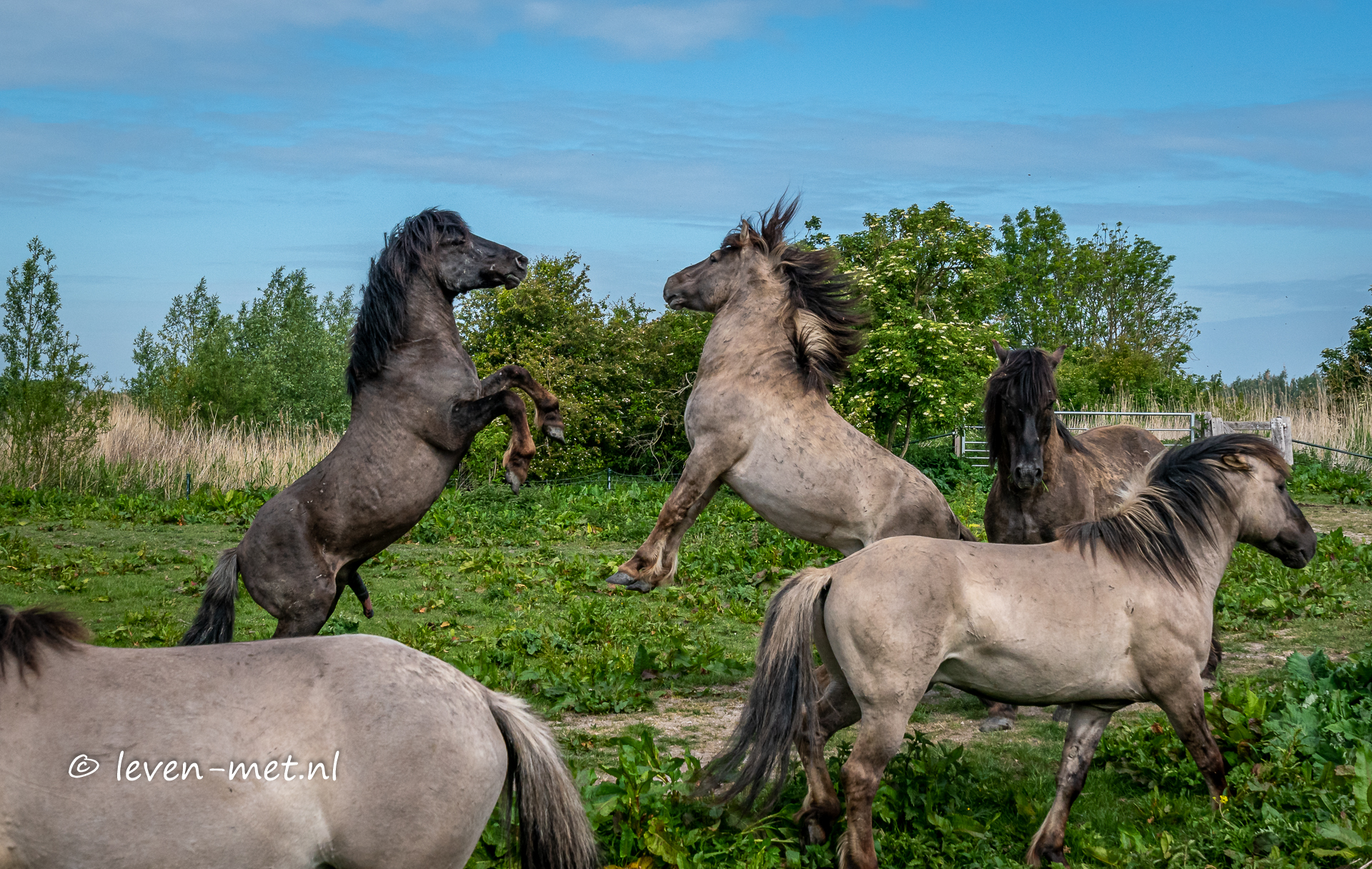 Ze staan voor het hek en ik kan er dus niet door. Uiteraard geen probleem dan blijf ik gezellig bij de konikpaarden kijken. En lekker veilig achter het hek. Toch is het leuk om wat foto’s te maken. Dus besluit ik om op het herten punt te gaan staan, en zo kan ik langs het hek een aantal mooie foto’s maken. De konikpaarden zijn lekker aan het eten en ook de kleintjes happen lekker mee. Natuurlijk moet de konik hengst even laten zien wat hij waard is.
