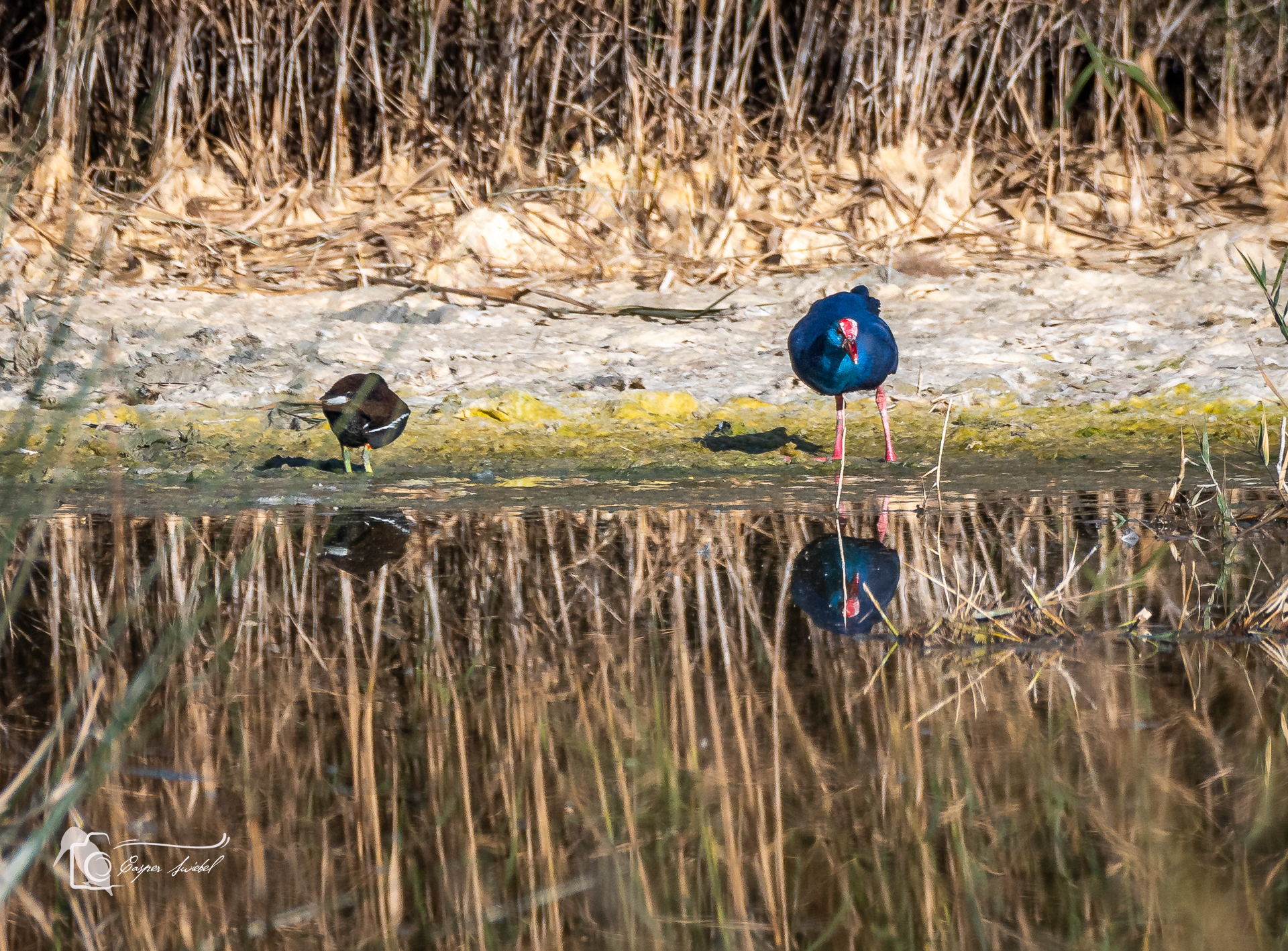 Dus camera’s uit de tas en knallen maar. Aan de overkant van deze plas waar we nu staan zie ik een grote vogel naast een waterhoen. Deze vogel herken ik niet gelijk, dus pak de camera er bij.