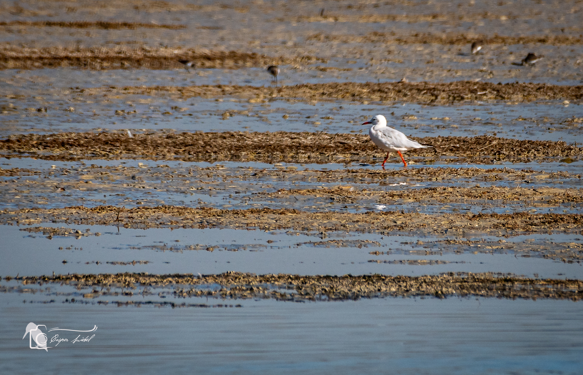 En voor de hut ook weer een tjiftjaf. Niet veel later aan de ander kant van de plas hangt er boven het riet een kiekendief. Te ver weg om mooi op de foto te zetten. Dan zie ik op de plas een meeuw scharelen, deze ziet er toch wel iets anders uit als de meeuwen die ik ken.