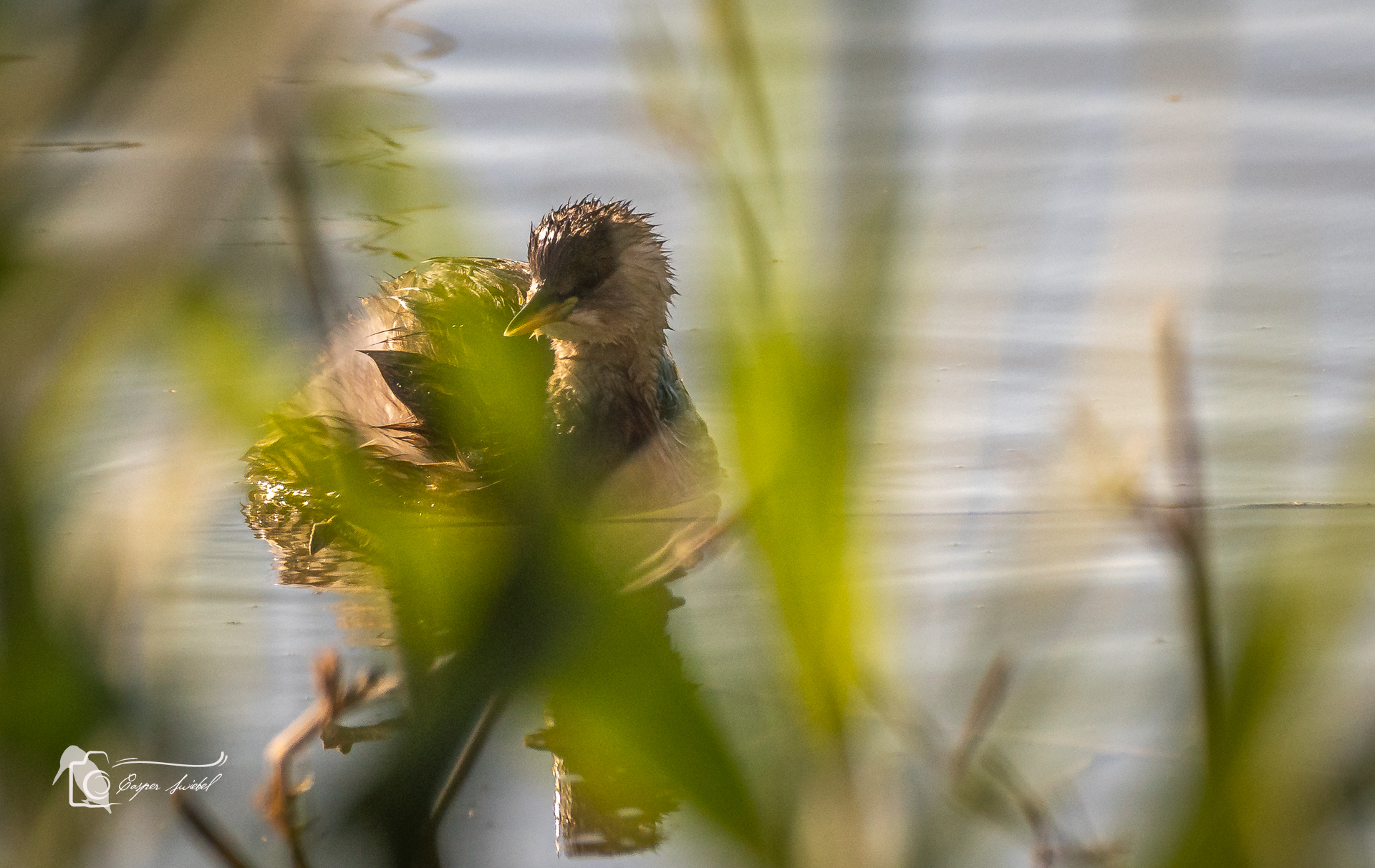 Zo camera weer in de tas en verder fietsen. We hoeven niet ver te fietsen of de volgende kijkhut komt al weer in zicht en zo stappen we weer af en gaan we lekker zitten. We zitten hier wel tegen het zon licht in te fotograferen maar de locatie is weer adembenemend. Een dodaars zwemt vlak langs de hut tussen de riet stengels.