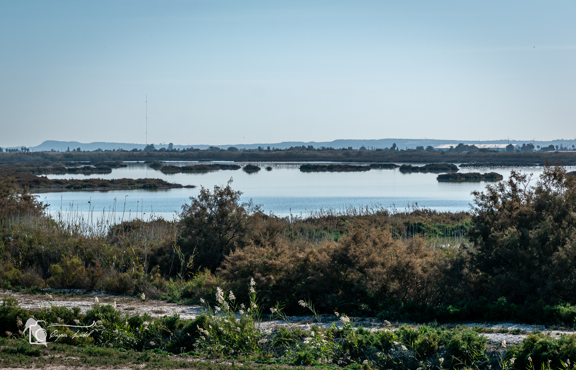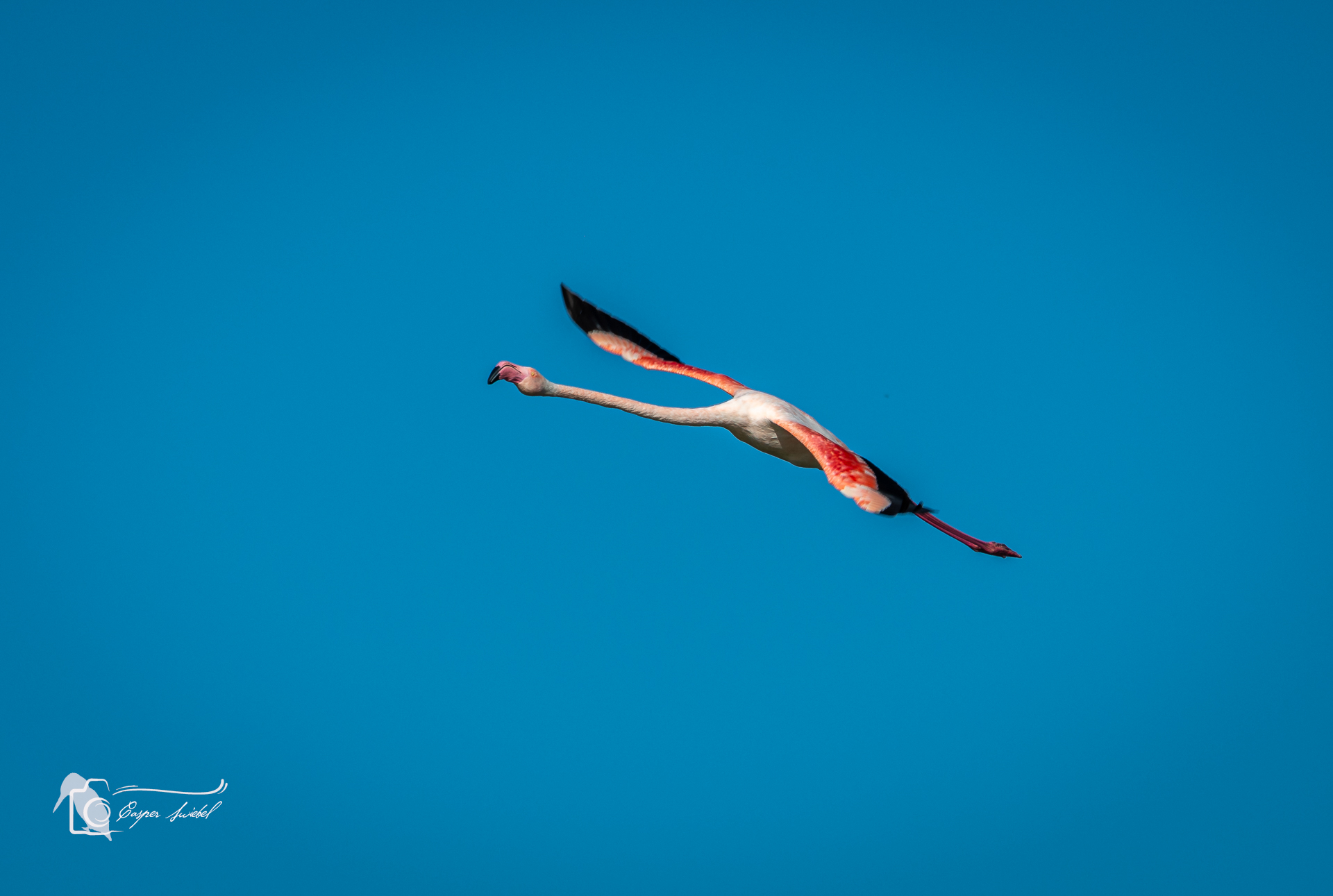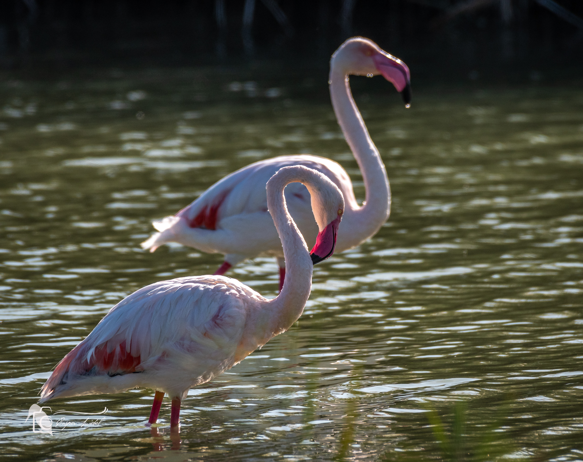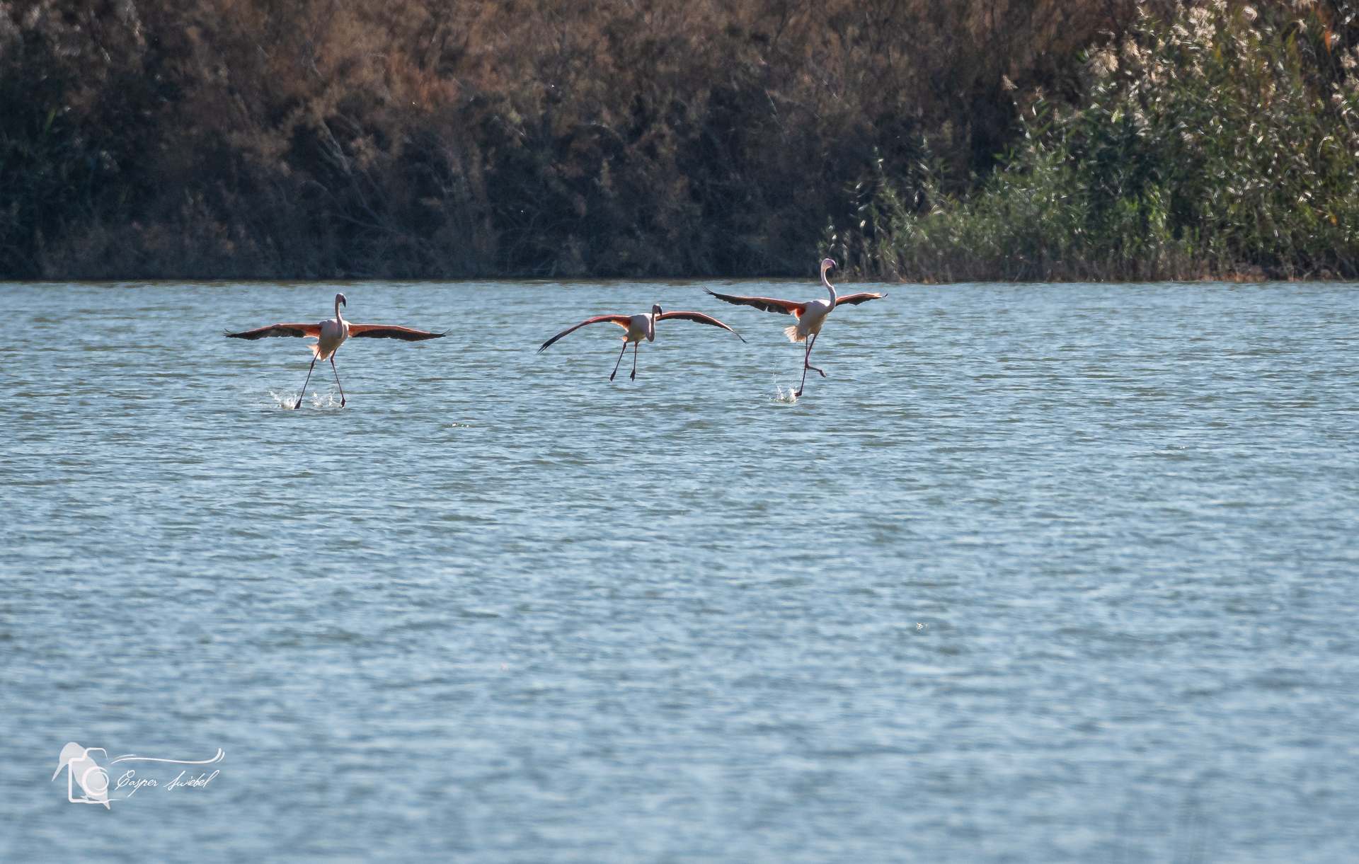 In de verte op deze plas landen drie flamingo’s die ik nog even probeer vast te leggen. Helaas natuurlijk tegen het licht in maar dat mag de pret niet drukken.