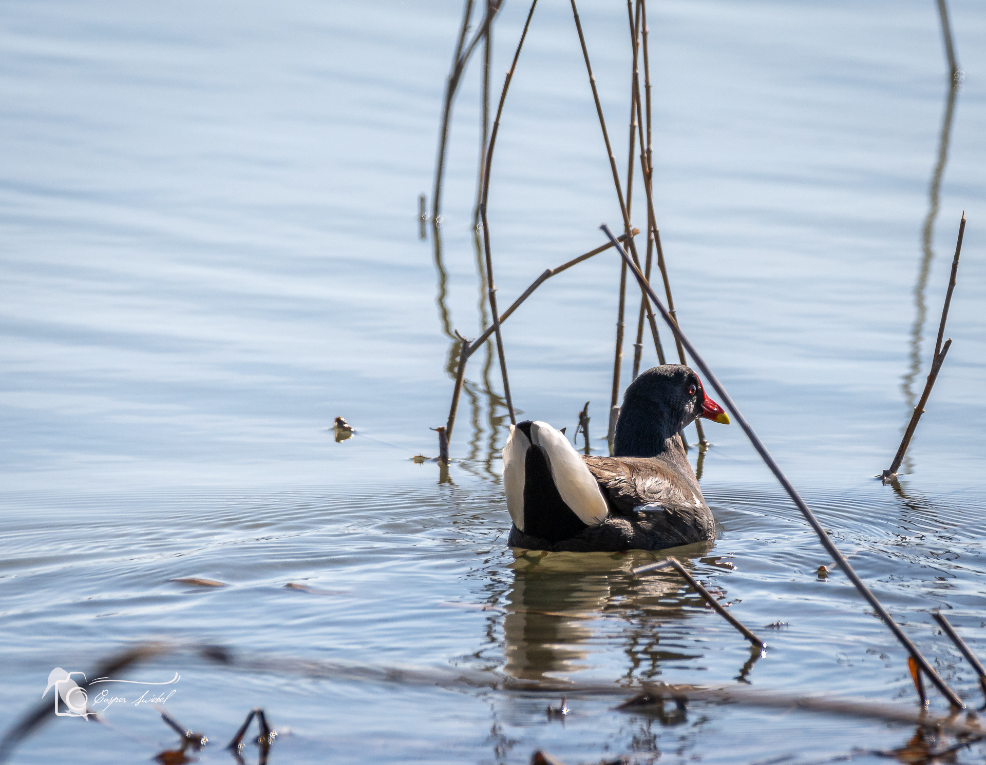 Links van de hut laat een waterhoen zich mooi zien, en ook mooi op de foto zetten.