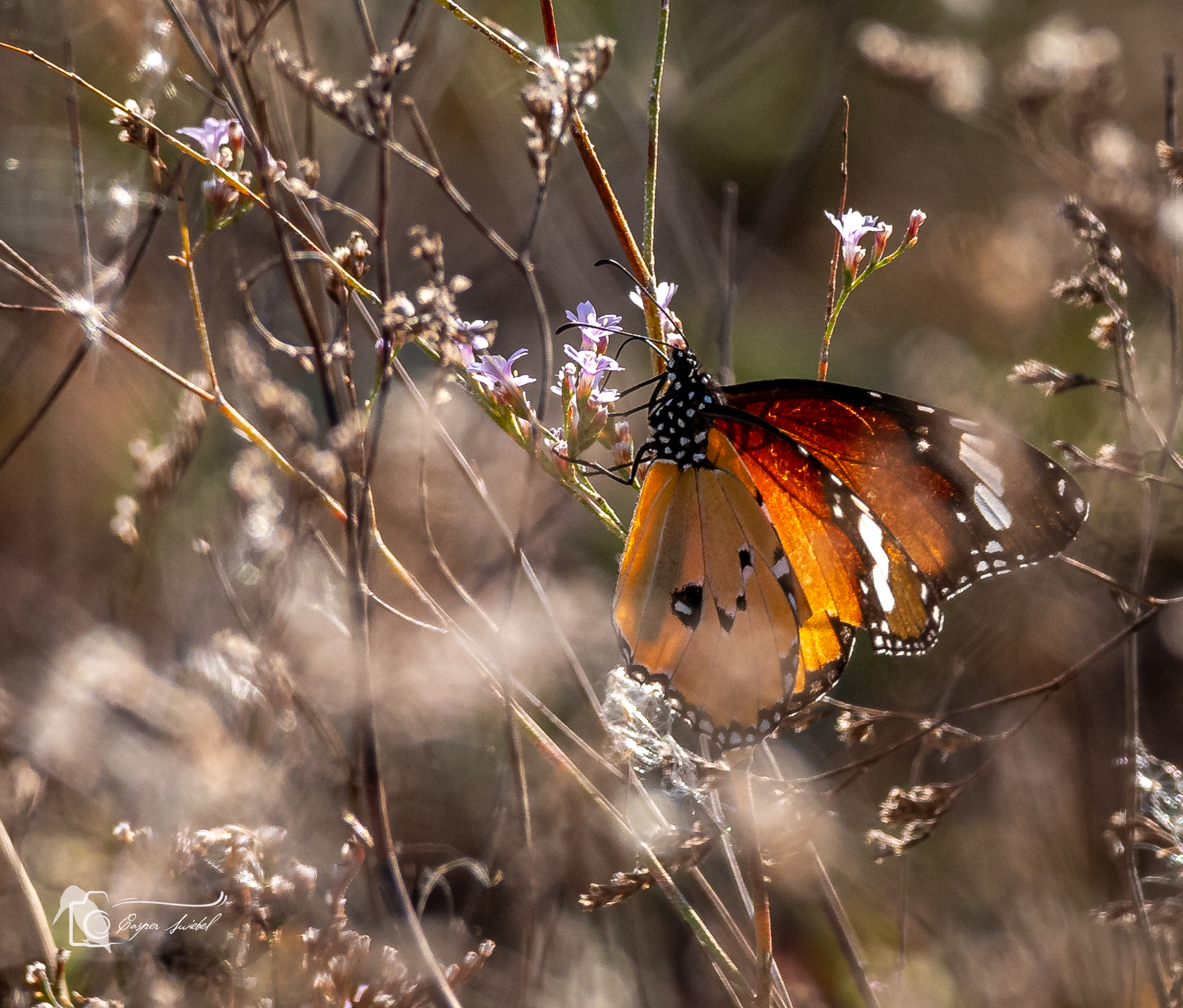 We besluiten om een lang pad langs een van de aanvoer kanalen te nemen om zo bij nog vier uitkijk plekken te komen. Dus alles weer in gepakt en onderweg. Toch stoppen we halverwege nog even aangezien we steeds een vlinder voorbij zien vliegen.