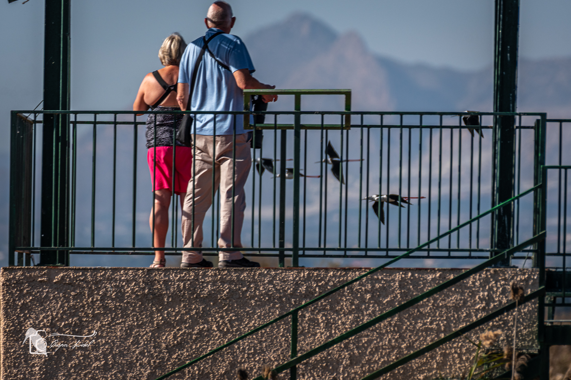 En zo komt er een groep steltkluten langs gevlogen. Die ik natuurlijk op de foto zet. Er staan ook een heer en en vrouw op de uitkijk toren die helaas te laat ziet dat er steltklutten aan komen.