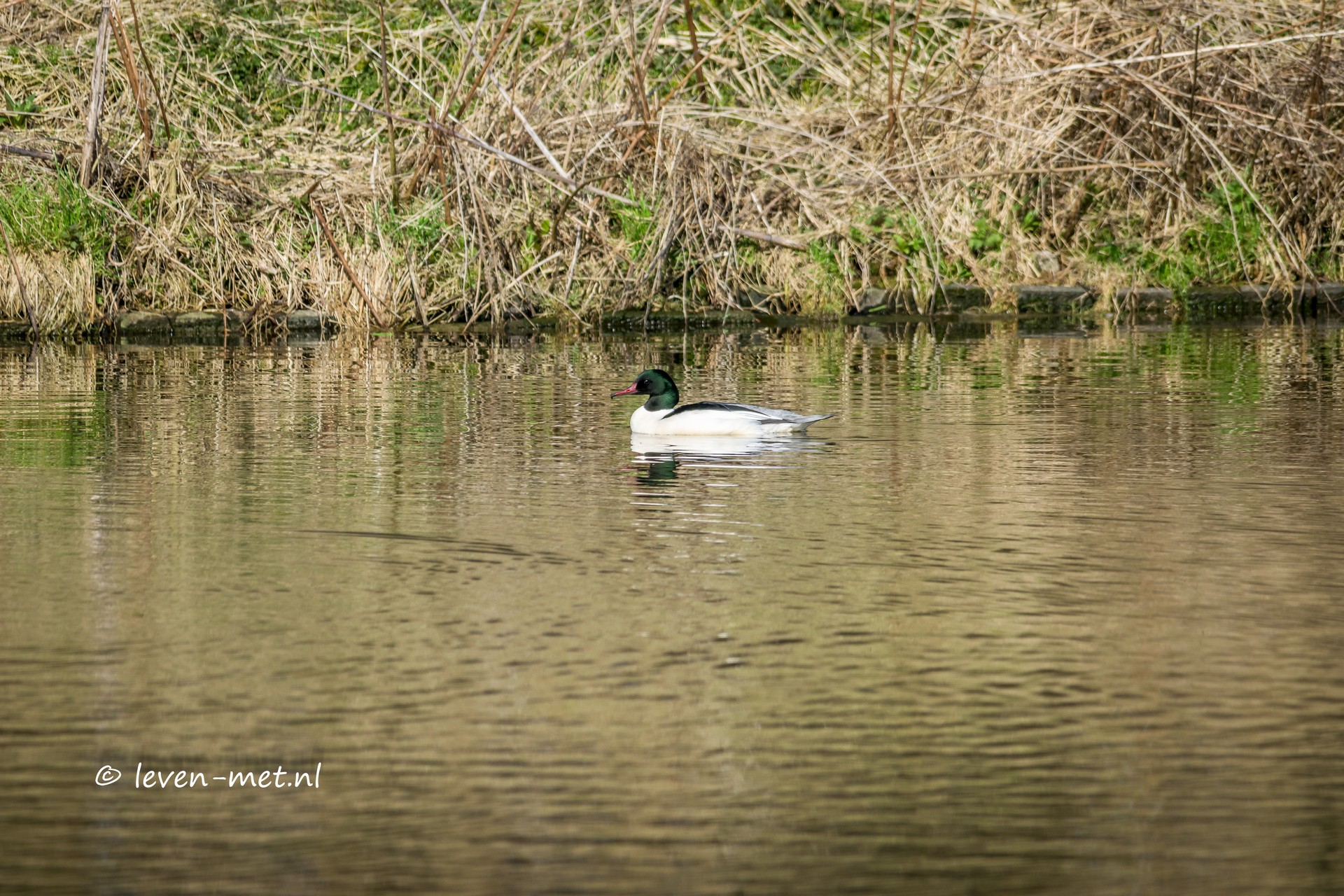 Vrijdag middag wordt een middagje Oostvaardersplassen en Oostvaardersveld. Na dat ik in de ochtend wat medische afspraken had en de hulp-boswachter vrij is gaan we samen lekker op stap. We hebben onze spullen gepakt en gaan naar de auto. We rijden nu op de trekweg en zien in de lage-vaart een mooie grote zaagbek zwemmen. Tja wat nu? Ze zijn zo schuw. Ik parkeer de auto verderop langs de trekweg. We stappen uit en sluipen als een vos naar de waterkant en verschuilen ons achter het riet.
