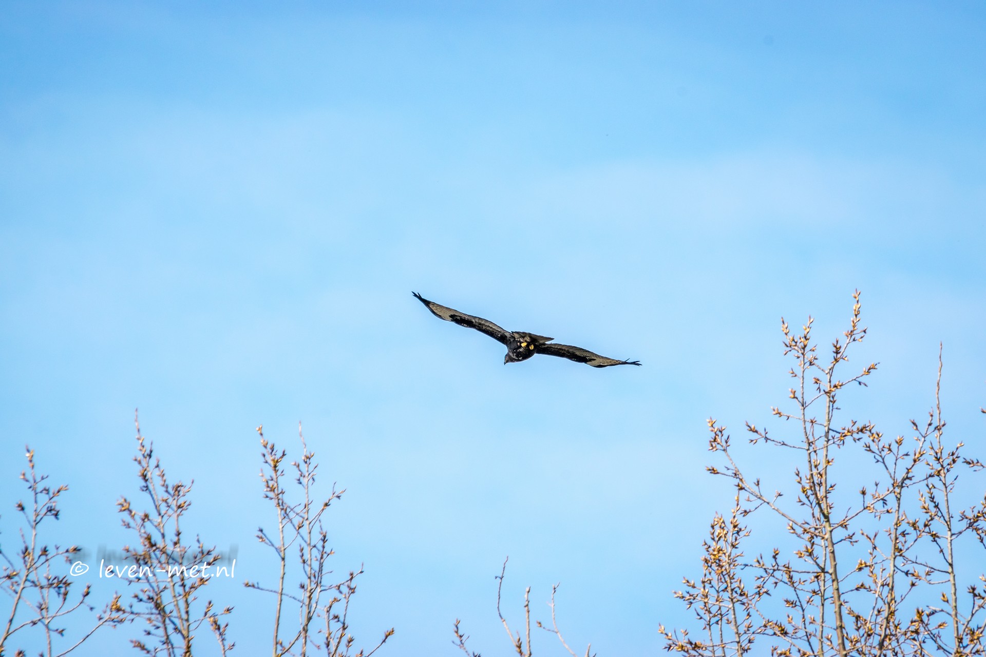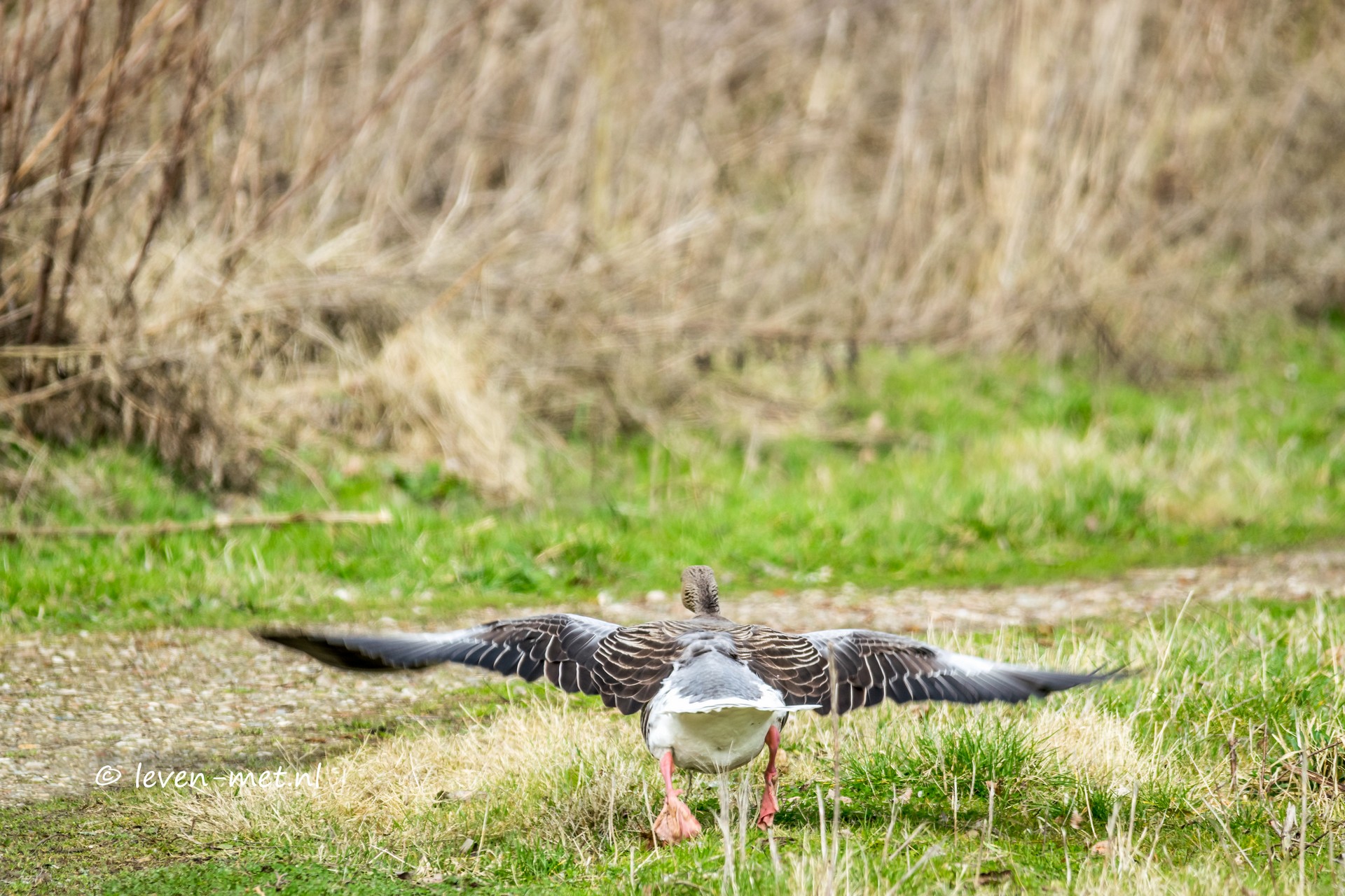 Een buizerd, een goudhaantje, en een koolmees. Wat een geluiden allemaal. En vlak bij het hekje staat een grauwe gans. Die uiteindelijk luidkeels wegrent en opstijgt.