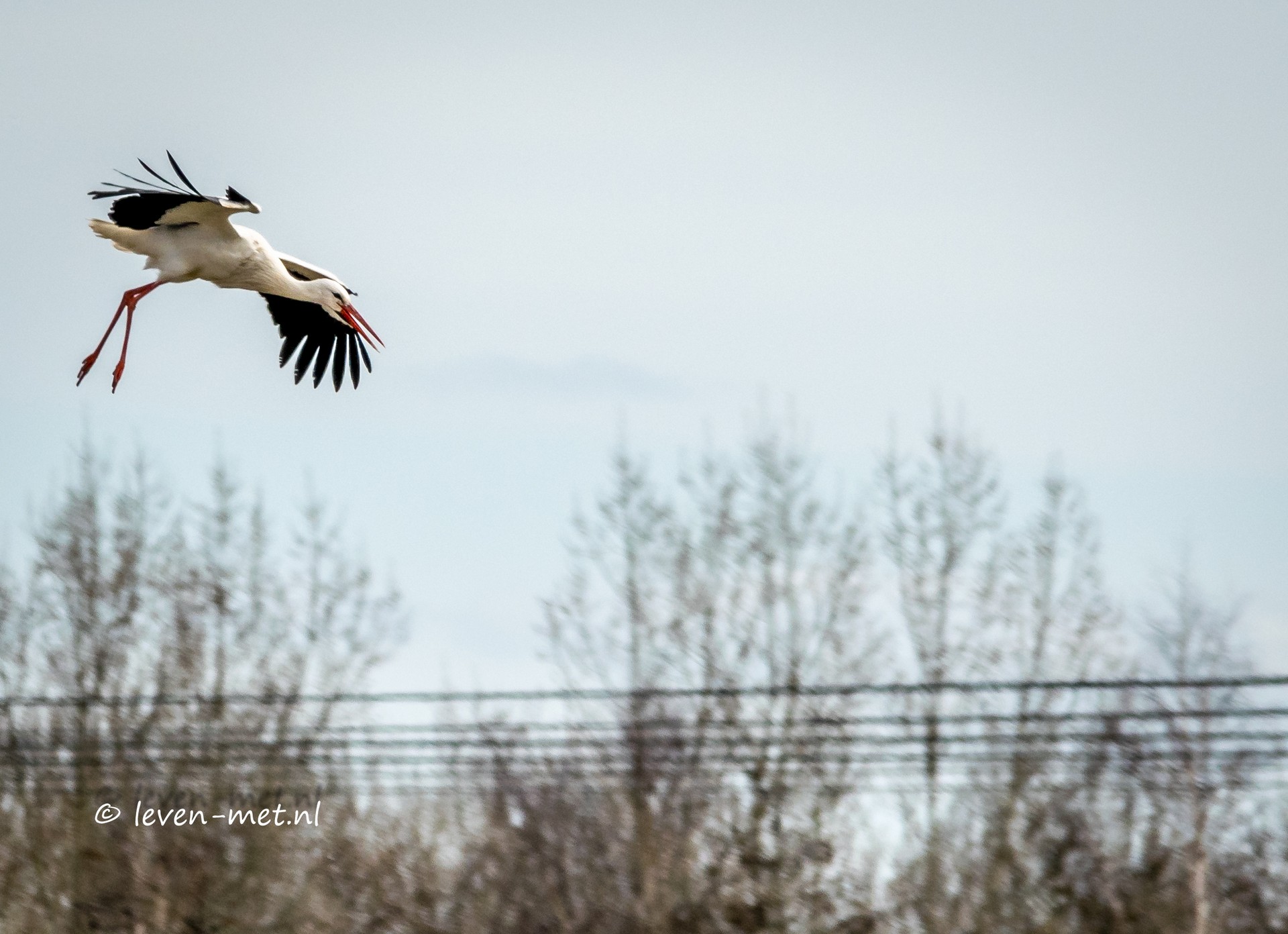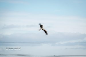 We zijn weer bij de auto en stappen in we gaan nu naar het natuurbelevingcentrum de Oostvaarders rijden. Halverwege de praamweg zie ik iets groots vliegen in de lucht ik stop bij het laatste boswachters toegangs hek en stap uit. Hé dat is een ooievaar. Ik pak de camera er bij en begin de ooievaar vast te leggen.