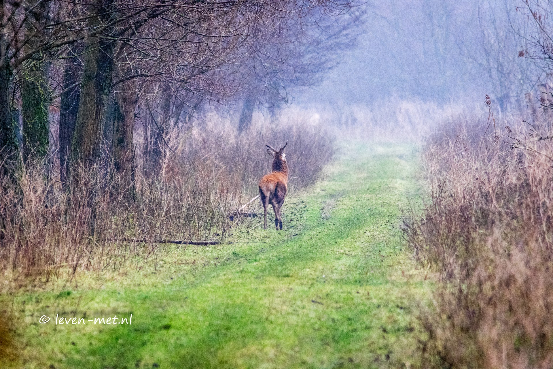 Dit kon ik dan wel weer mooi vast leggen maar had het wel te doen met de kleine rakker. Ik fiets weer door en kom nog meer edelherten tegen in het Oostvaardersbos. Het is nog steeds wel erg mistig maar minder als in de morgen. Hier blijf ik even staan kijken naar de mooie edelherten en wat zijn het er veel zeg.
