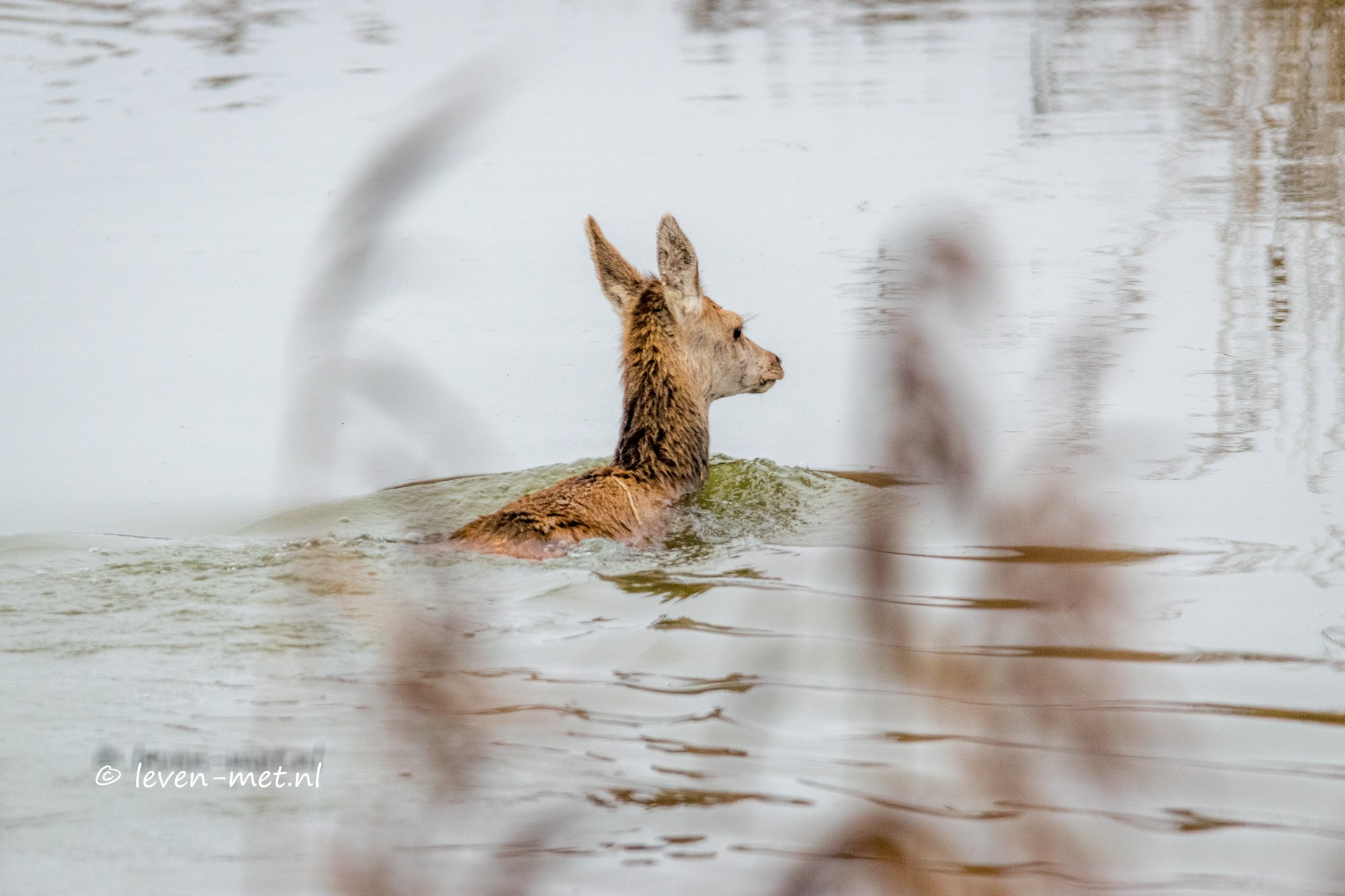 Ik ga ook verder en kom uiteindelijk boven op het Jan van den Bosch uitkijkpunt. Op de vlakte staan de konikpaarden en de edelherten. Dus die leg ik natuurlijk even vast op de geheugenkaart. Ik fiets verder en vervolg de route via het Jan van den Boschpad. Dan schrikt een jong edelhert dat ik daar met de fiets ben en sprint het weg. Ik roep nog doe nou rustig ik doe niks. Maar dat is tegen dovemans oren gezegd. Uiteindelijk loopt deze kleine zich vast bij het wildrooster op het fietspad. Ik blijf op afstand om het edelhert niet verder op te jagen of onrustig te maken. Uiteindelijk duikt het jonge edelhert toch maar de Oostvaardersplassen in en zwemt naar het schiereiland.