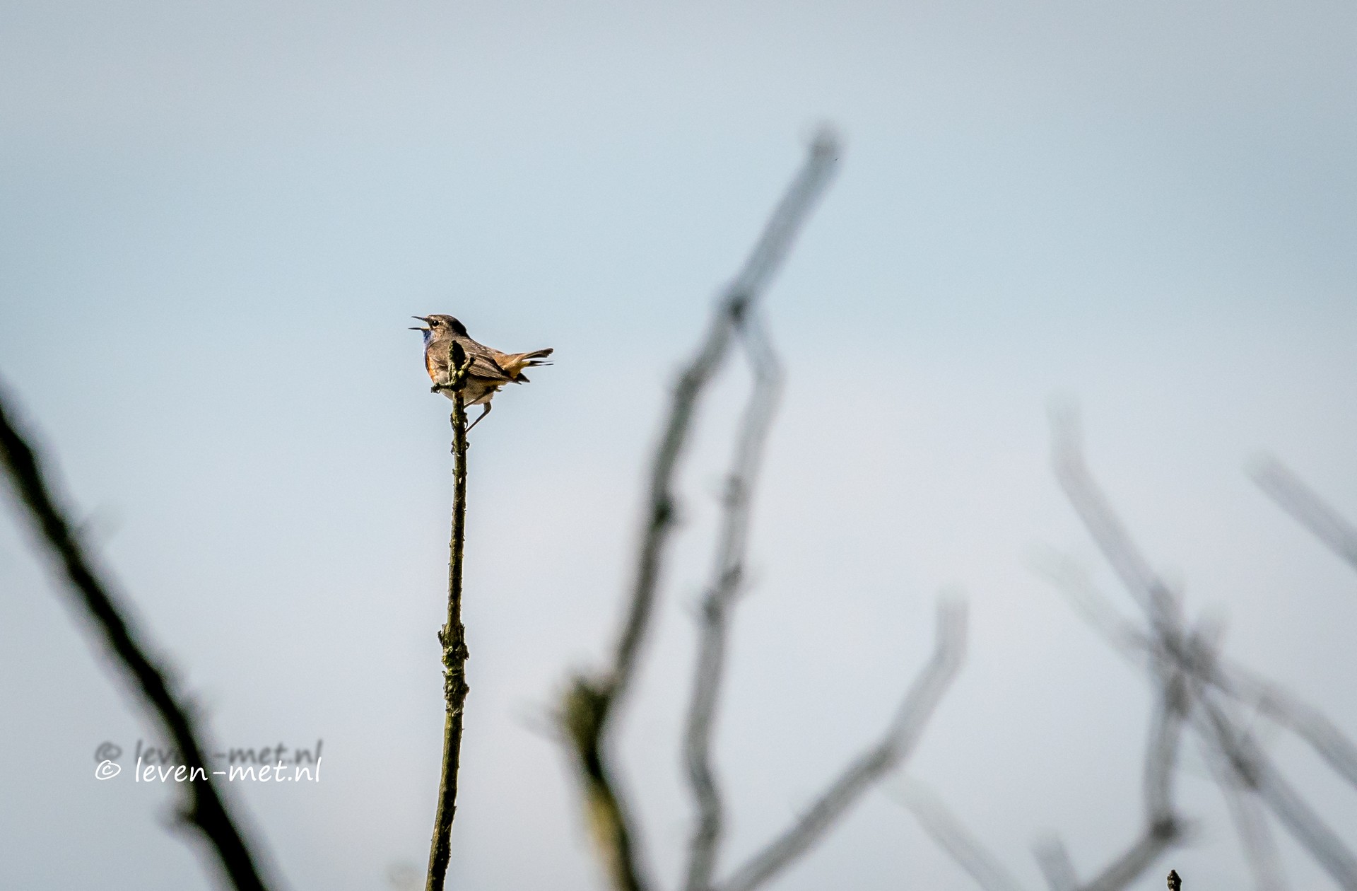 Ik zie de blauwborst op het bovenste takje van een boom zitten en wat een riedel komt daar uit zeg.