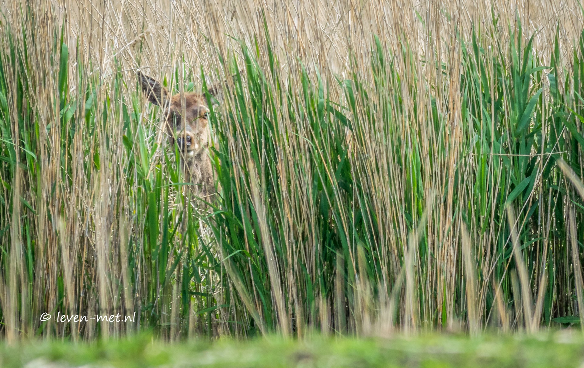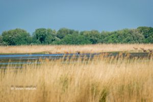 In de poelen wemelt het van de kikkers en het is een oorverdovend lawaai. Ook hoor ik de koekoek dichterbij komen en kan hem uiteindelijk spotten in een boom. Ik rij verder naar de auto en vlak voordat ik de driehoek verlaat spot ik nog een edelhert door het riet heen die aan het overkant van het water staat. Zou ze het doen.