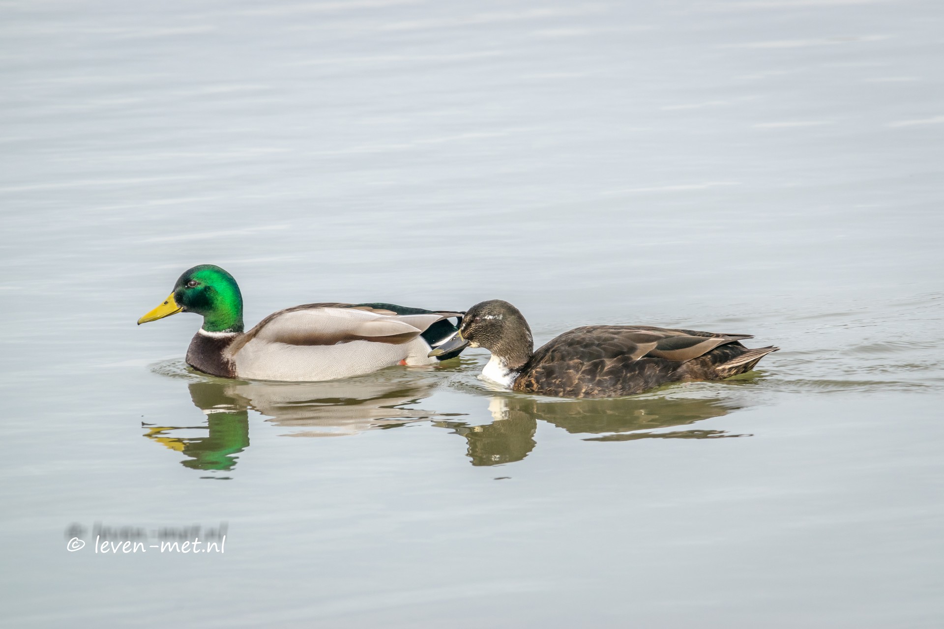 De overige blauwereigers zijn druk met hun bestellingen die ze om de beurten komen ophalen. Een prachtige wilde eend met zijn vrouwtje komt ook even langs en dat zet ik even op de foto. Eigenlijk wel een ondergeschoven eenden soort de wilde eend maar wat een kleuren pracht. Het mannetje dan.