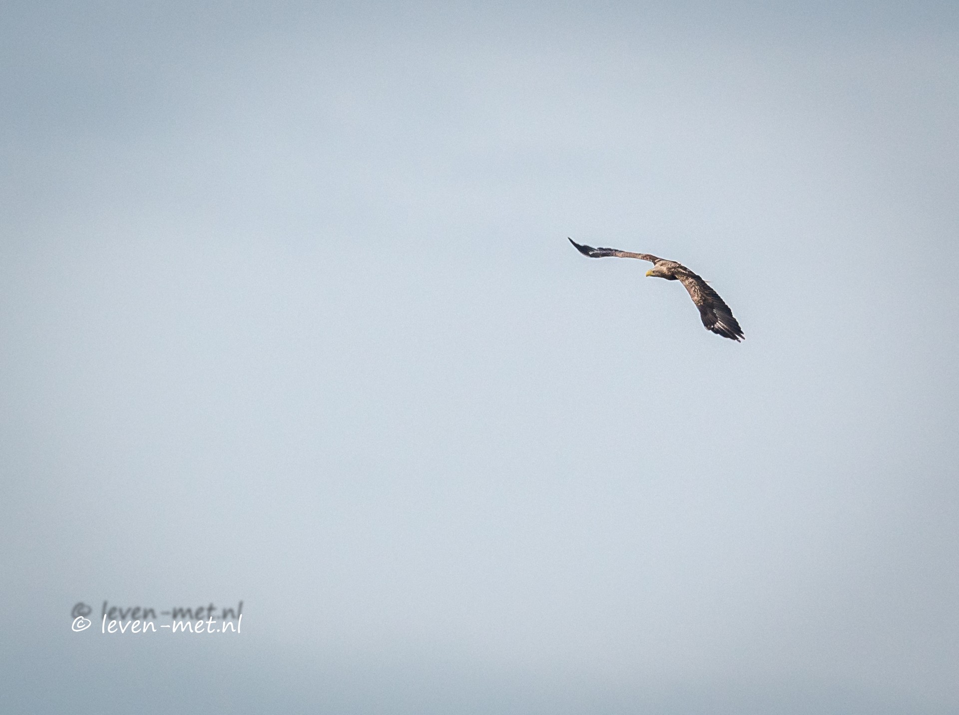 Dan komt ineens uit het niets de zeearend aangevlogen en dat zal de camera weten. Heel ver in de verte komt hij aanvliegen en pers ik de een na de andere zeearend in het geheugenkaartje. Het is jammer dat het zover weg is maar de camera en de lens hebben hun best weer gedaan. Het staat er nog redelijk op ook mag niet klagen.