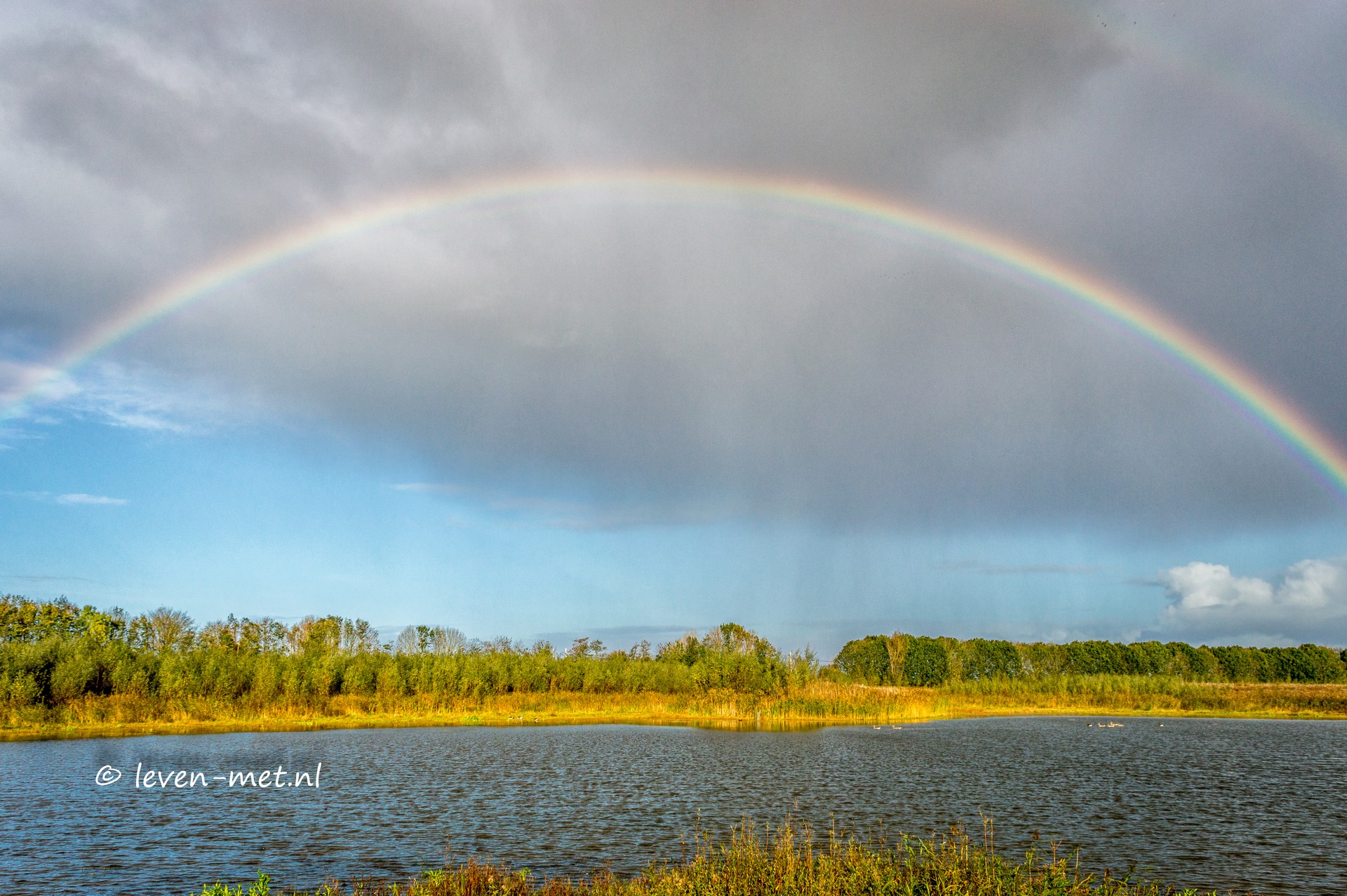 Een mooie regenboog ontstaat en wordt steeds groter. Uiteindelijk zet ik het op de foto ik vind het wel een mooi plaatje geworden. Een paar mooie krakeenden komen nog langs gevlogen maar verder is het stil bij de oeverloperhut.