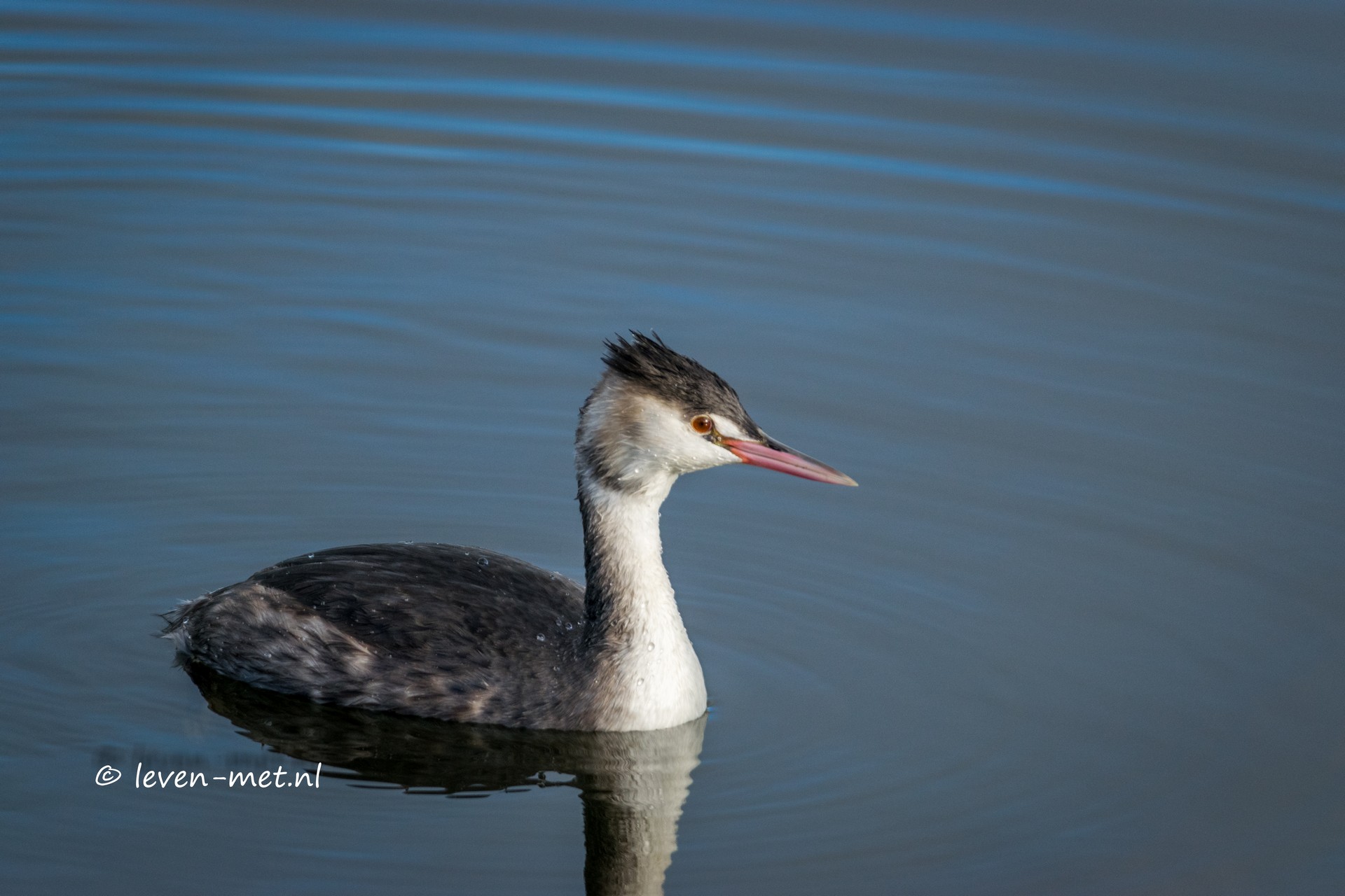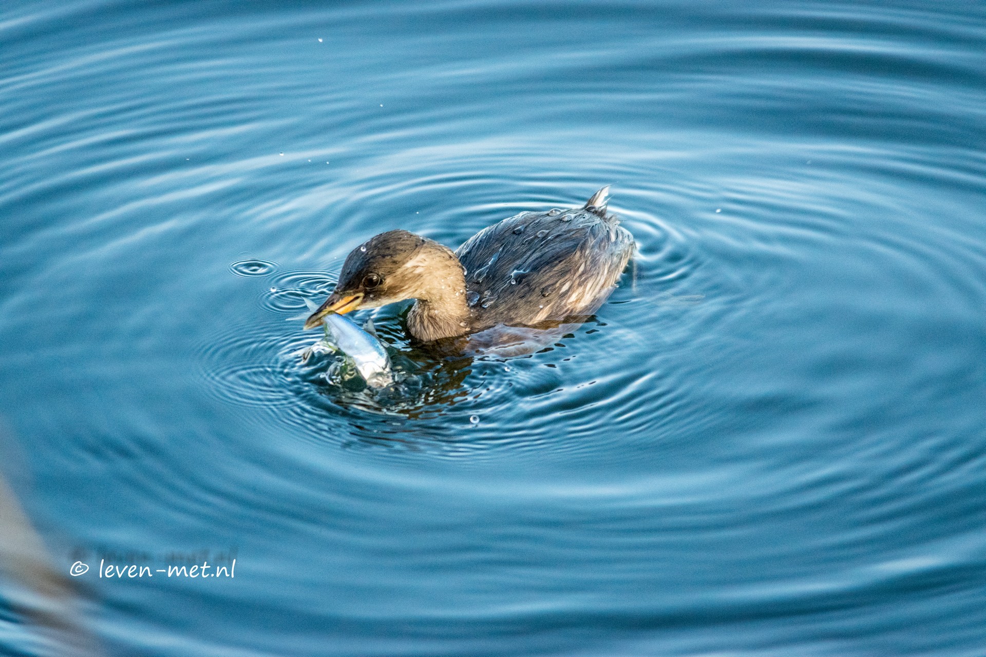 En die laat heerlijk zien hoe je poetst en vis vangt. In de verte komt een klein bolletje wol aan gezwommen. Het is even goed kijken maar inderdaad een leuke dodaars. De dodaars komt steeds dichterbij en gaat lekker vissen. De dodaars gooit zijn hengeltje uit en pats daar is het eerste visje.