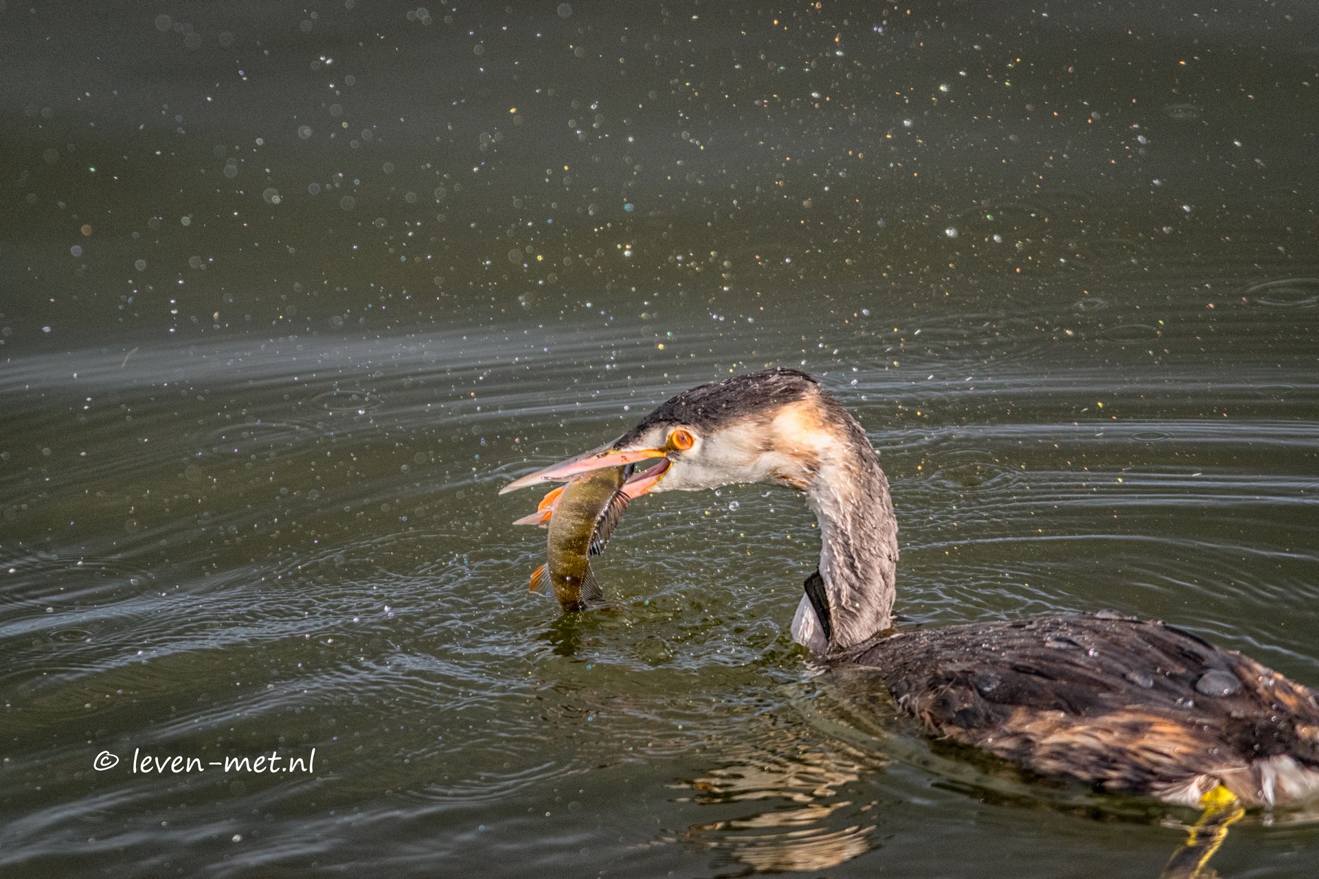 De ijsvogel kijkt een beetje om zich heen ook op zoek naar zijn visjes. Maar uiteindelijk lukt het een van de futen om toch een vis te vangen.
