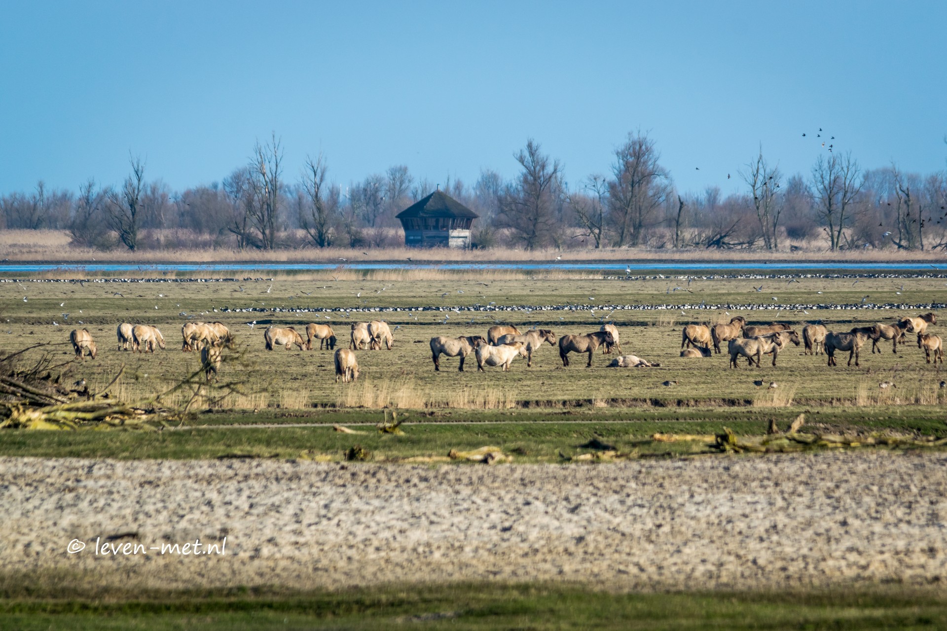 Vrijdag ochtend even een klein uurtje op pad. Ik moet er even uit maar ga zeker niet te lang op pad. Ik pak de auto en rij naar de praamweg. Als eerste ga ik even bij de grotepraambult kijken. Ver op de vlakte liggen de edelherten lekker in het zonnetje op temperatuur te komen. En daar achter liggen duizenden brand-ganzen. Iets dichterbij en kijkend naar de zeearend hut staan de konikpaarden.