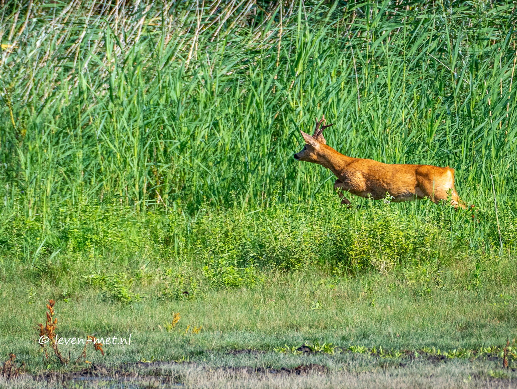 Ook de boerenzwaluw wil wel even poseren. Dan ineens komt er uit het riet een leuke ree (bok) te voorschijn. En die gaat even lekker staan knabbelen aan het gras.