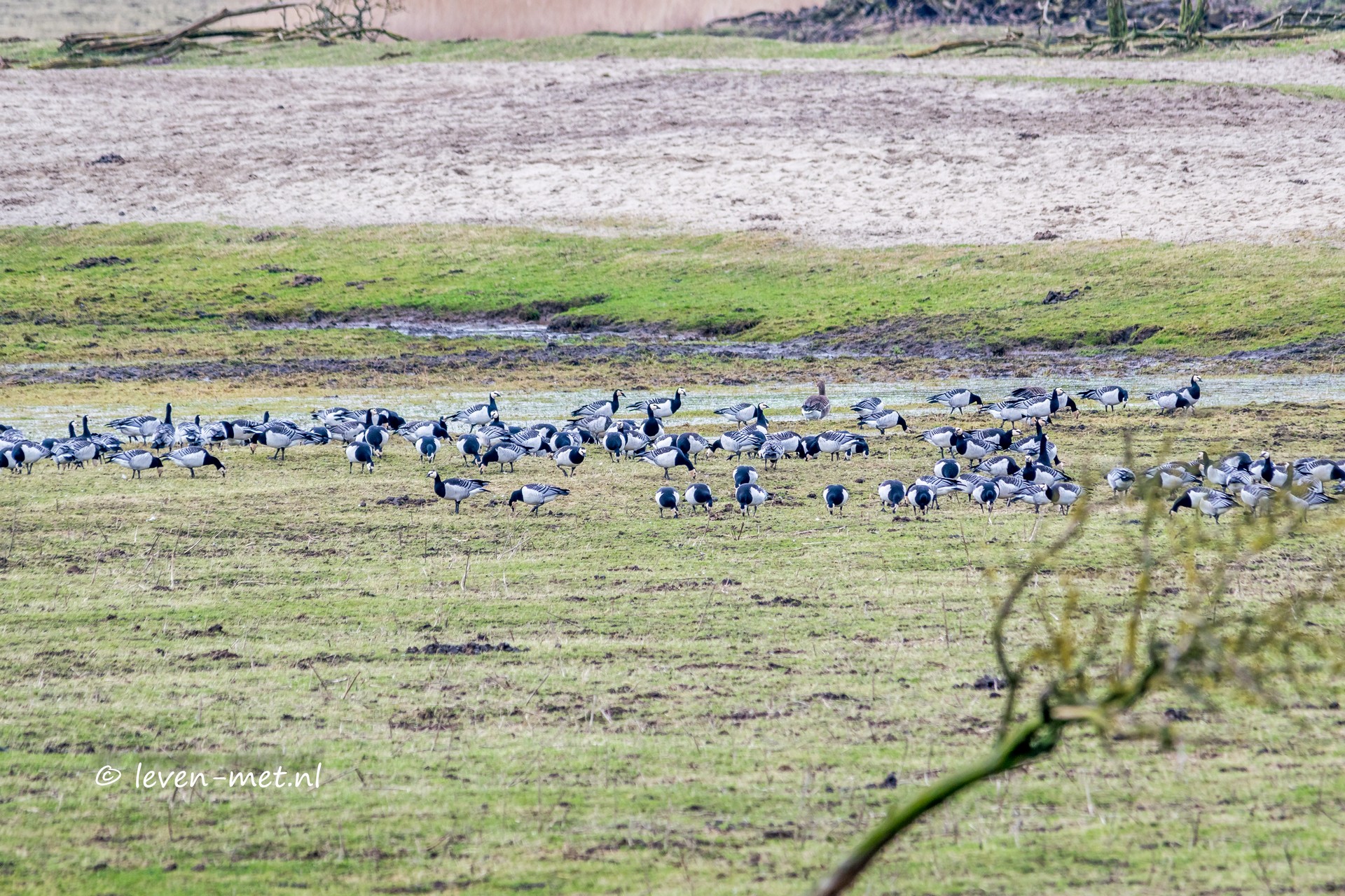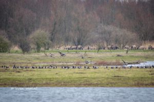Zaterdagmiddag een Oostvaardersveld middag. Ik rij om even over één weg van huis en ga eerst even naar de grote Praambult. Dit doe ik via de trekweg. Helaas zie ik op de trekweg onder het viaduct van de buitenring een matras in de bosschage liggen. Later op de dag maak ik er even een melding van bij de gemeente Almere. Even verder op de trekweg zie ik dat de slagboom weer stuk gemaakt is van de inrit naar de elektriciteitsmasten. Hier maak ik gelijk even een foto van en stuur dit gelijk even door naar de boswachters van Staatsbosbeheer. Aangekomen op de praamweg draai ik de praambult op en parkeer ik de auto. Er staan behoorlijk veel collega spotters in afwachting of de zeearend zich laat zien op de vlakte. Ik pak de camera en zie dat er een grote groep met brandganzen op de vlakte zit.
