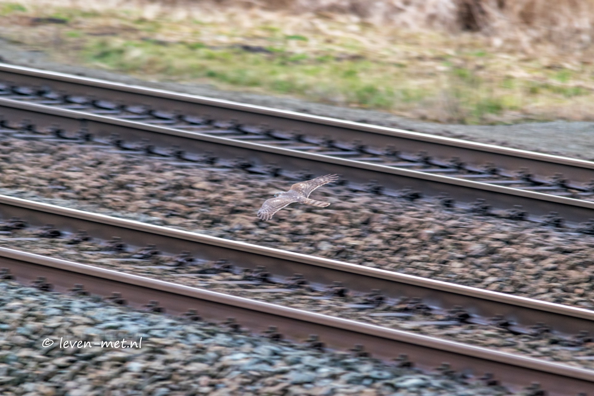 En er vliegen twee grauwe ganzen voorbij. Ook is er een nieuw soort trein die langs komt flitsen een valktrein. Een valkje scheert laag over de rail en verdwijnt zo de bosschage in ik had niet eens de tijd om echt goed scherp te stellen.