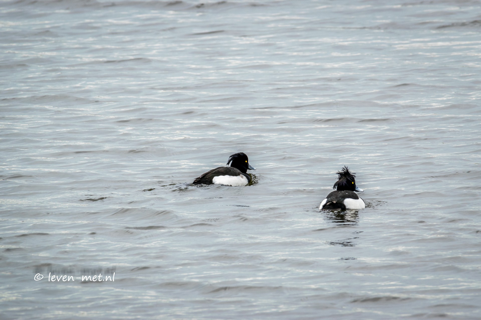 Het zijn voornamelijk kuifeenden en door de wind is de kuif goed zichtbaar. Dan vliegen de brandganzen die verder op het Oostvaardersveld zitten massaal op. Met zijn honderden tegelijk de lucht in. Er moet iets zijn maar ik kan het niet ontdekken. Dan komt het futen paartje weer bij elkaar. En duiken ze beide naar rabarber. Om weer boven water naar elkaar toe te zwemmen en bam flats hé doe eens rustig lijkt de ene fuut te zeggen dit hebben we gister al uitgebreid gedaan.
