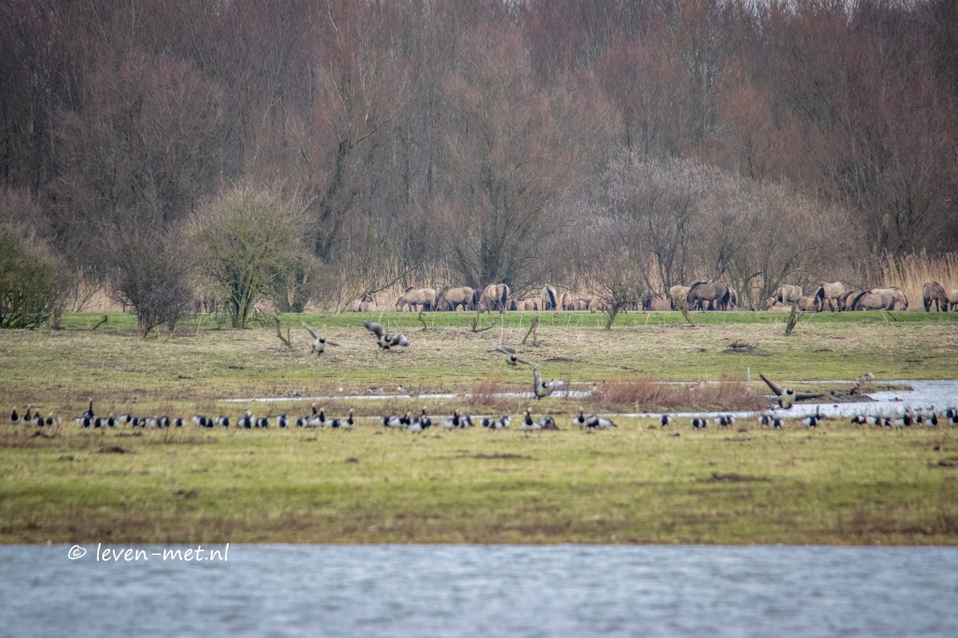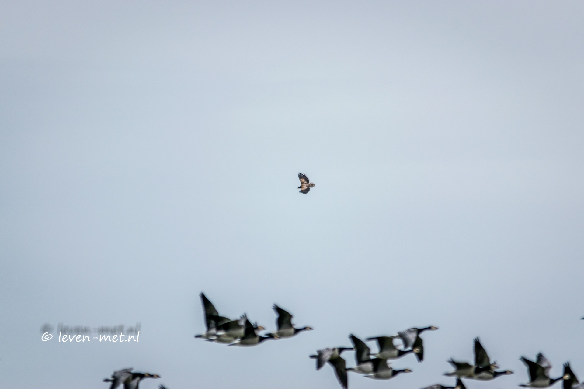 Ook zitten er vlak bij de konikpaarden een grote groep met brandganzen die zo nu en dan met zijn allen te gelijk omhoog vliegen. Helaas kan ik nog steeds niet zien wat er aan de hand is. Maar inmiddels ben ik een ijspegel en heb ik veel pijn. Het wordt tijd om de warmte op te zoeken. Dus lekker naar de auto en kachel op tien. Dan vliegen de brandganzen weer op met zijn allen en kijk ik vanuit de auto of ik iets kan zien. En ja eindelijk zie ik de verantwoordelijke het is de zeearend nog even een paar shotjes maken en dan snel raampje weer dicht.