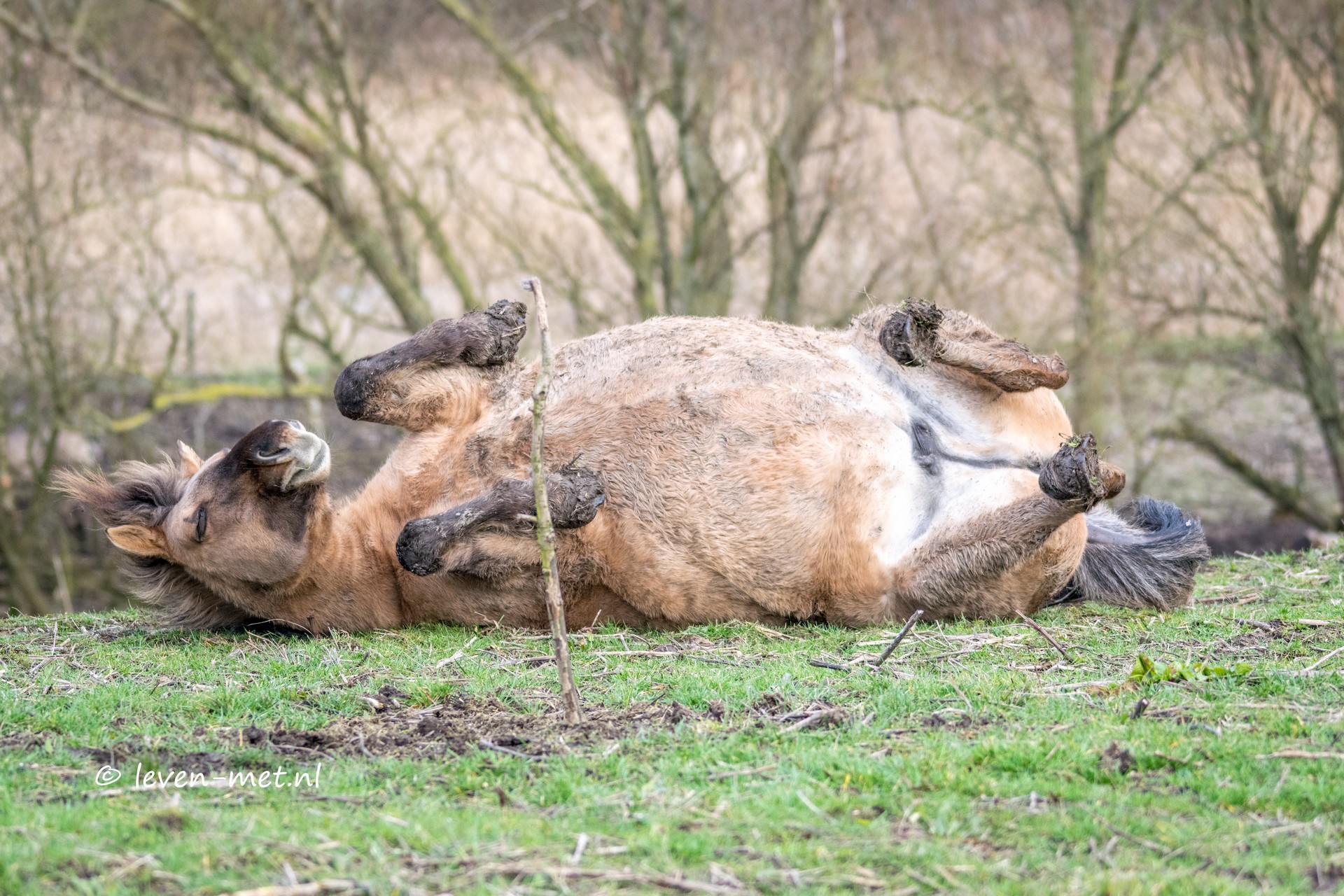 Zo heb het een beetje koud gekregen en pak de spullen bij elkaar en ga richting de auto. Ik heb inmiddels gezien dat de konikpaarden op de uitkijkbult staan in het Oostvaardersveld. Ik ben bij de auto en rij die kant op. Parkeer mijn auto bij het hek en zo sta ik bij de konikpaarden. Wat zijn het toch prachtige dieren. Er komt zelfs een konikpaard naar mij toe lopen en gaat voor mijn neus heerlijk liggen rollen bollen in het gras.