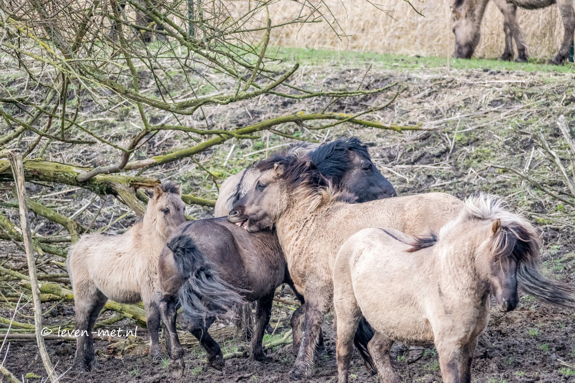De wind wordt steeds harder en daardoor kouder. De konikpaarden krijgen het ook op hun heupen van de wind. De een na de ander bijt en schopt er op los. Ze kunnen ook zo lief zijn voor elkaar. Maar het geeft wel weer mooie foto’s van de konikpaarden.