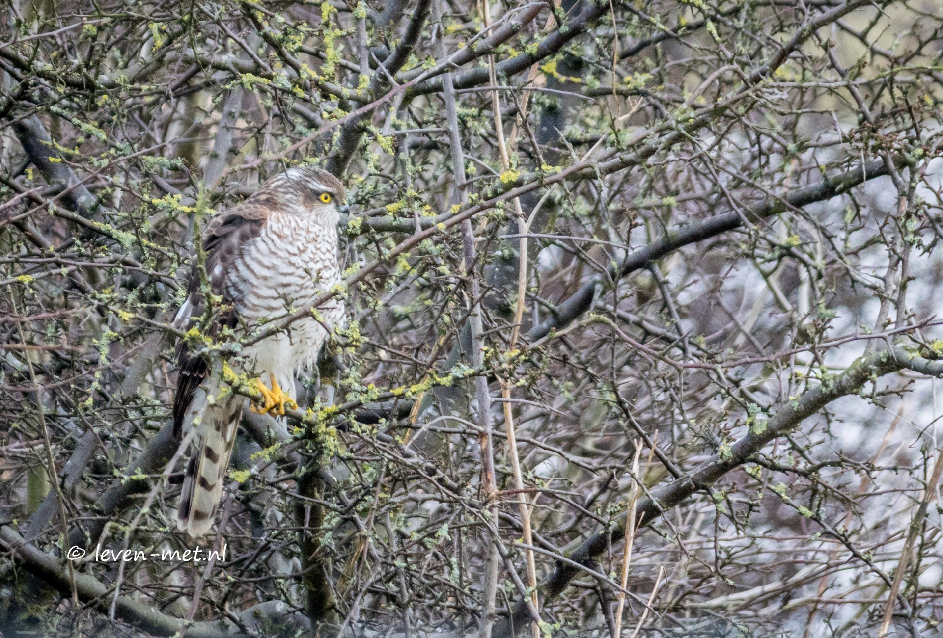 De konikpaarden staan op de Oostvaardersplassen vlakte. En heel ver weg zijn de edelherten. We stappen weer in de auto en gaan naar de poelruiterhut. Onderweg zien we ook J-P nog langs de kant van de weg staan. Hij is iets aan het fotograferen en we zwaaien even. We rijden verder en even verder op parkeren we de auto. J-P komt al aangereden en stapt uit. En zegt tegen ons als je nog een mooie sperwer op de foto wil zetten moet je even naar het plekje rijden waar ik net stond. We draaien de auto nog even en proberen de sperwer te vinden. Uiteindelijk draai ik de auto bij de laatste ingang van het Oostvaardersveld waar de boswachters met hun auto naar binnen kunnen rijden. Ik zeg tegen de hulp-boswachter we hebben hem niet kunnen vinden. En dan ineens valt mijn oog op een bosje en daar zit de sperwer in. We rijden langzaam de auto die kant op en stoppen tegen over de sperwer.
