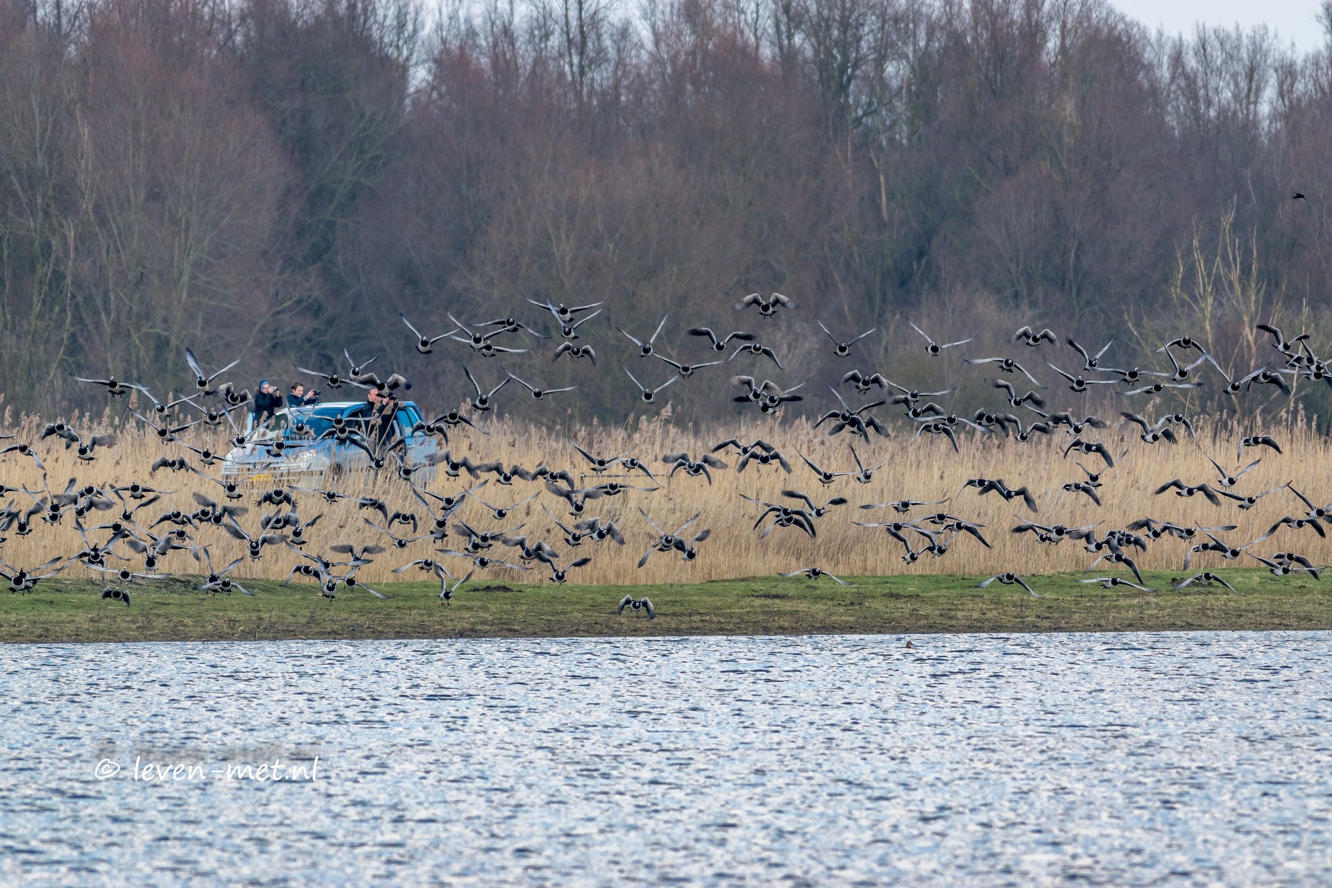 Dus lopen we weer verder. Aangekomen in de hut zitten​ collega spotters​ Ron en Henk er ook al. Ron kende ik al vanuit de lepelaarhut. En met Henk heb ik gelijk even kennis gemaakt. Ook de hulp-boswachter wilde even netjes een handje geven aan Henk. En dat wilde Henk ook wel. En die vraagt aan haar of zij de beroemde hulp-boswachter is waar veel over gelezen wordt. Ja zegt de hulp-boswachter dat ben ik. Verder wordt er nog even gekletst en natuurlijk speuren we de waterkant af. Op de praamweg stop er een auto naast de brand-ganzen vervolgens springen er vier paparazzi fotografen uit en beginnen foto’s te maken.