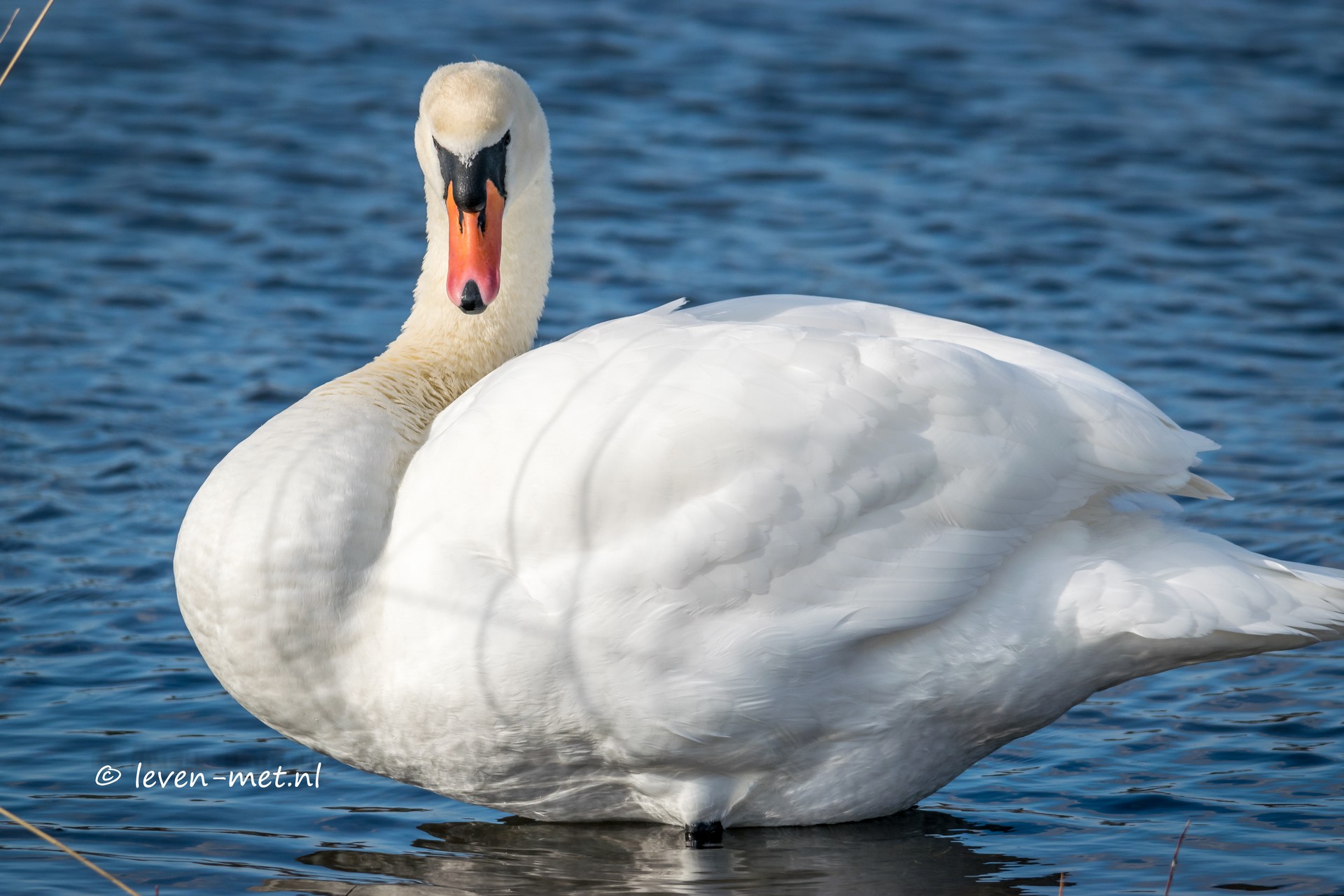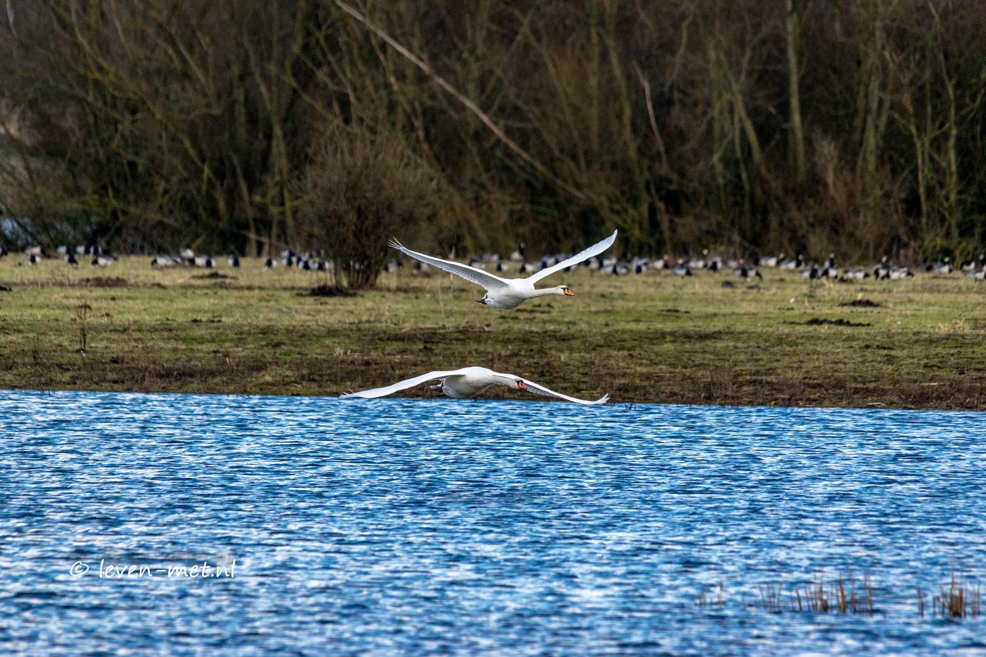De hulp-boswachter wil graag een stukje lopen dus pakken we de spullen weer in en vertrekken we. We lopen richting de auto en bij het hekje besluit de hulp-boswachter dat we nog even naar de overkant gaan. De overkant is de oeverloperhut dus daar lopen we even naar toe. Twee prachtige knobbel zwanen zitten voor de hut en ook  Ron is daar nog even. Zo nu de mooie knobbel zwanen op de gevoelige plaat vast leggen.