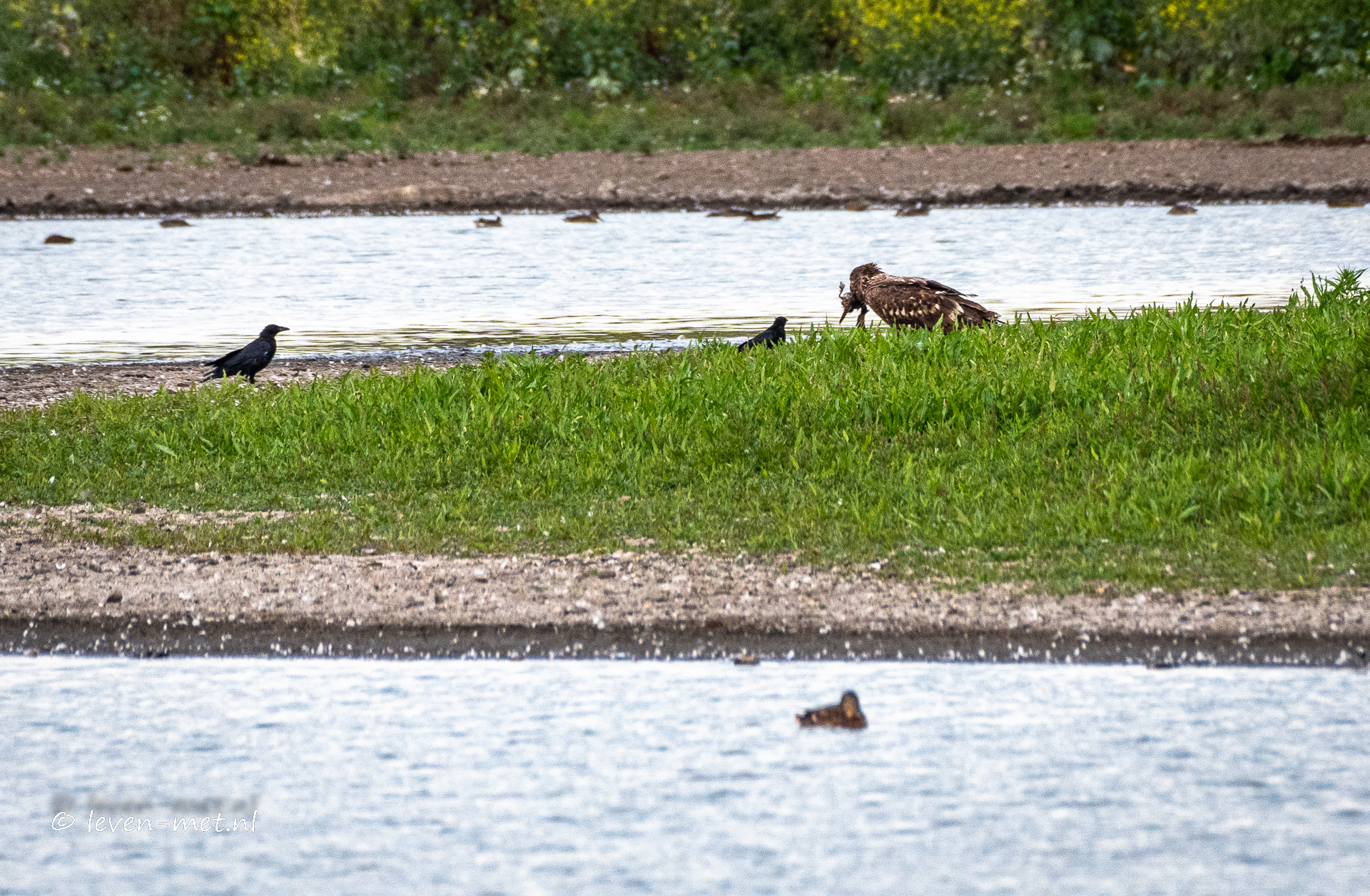 Dat is weer een mond vol (jong roodborsttapuit) zo op de vroeg ochtend. Ik kom in de hut en er zijn al twee collega fotografen aanwezig Harry, en Pieter. De zeearend is er ook al, en zit op de hoek van het eiland iets te nuttigen. Het is een jonge zeearend, die ook nog eens wordt lastig gevallen door kraaien.