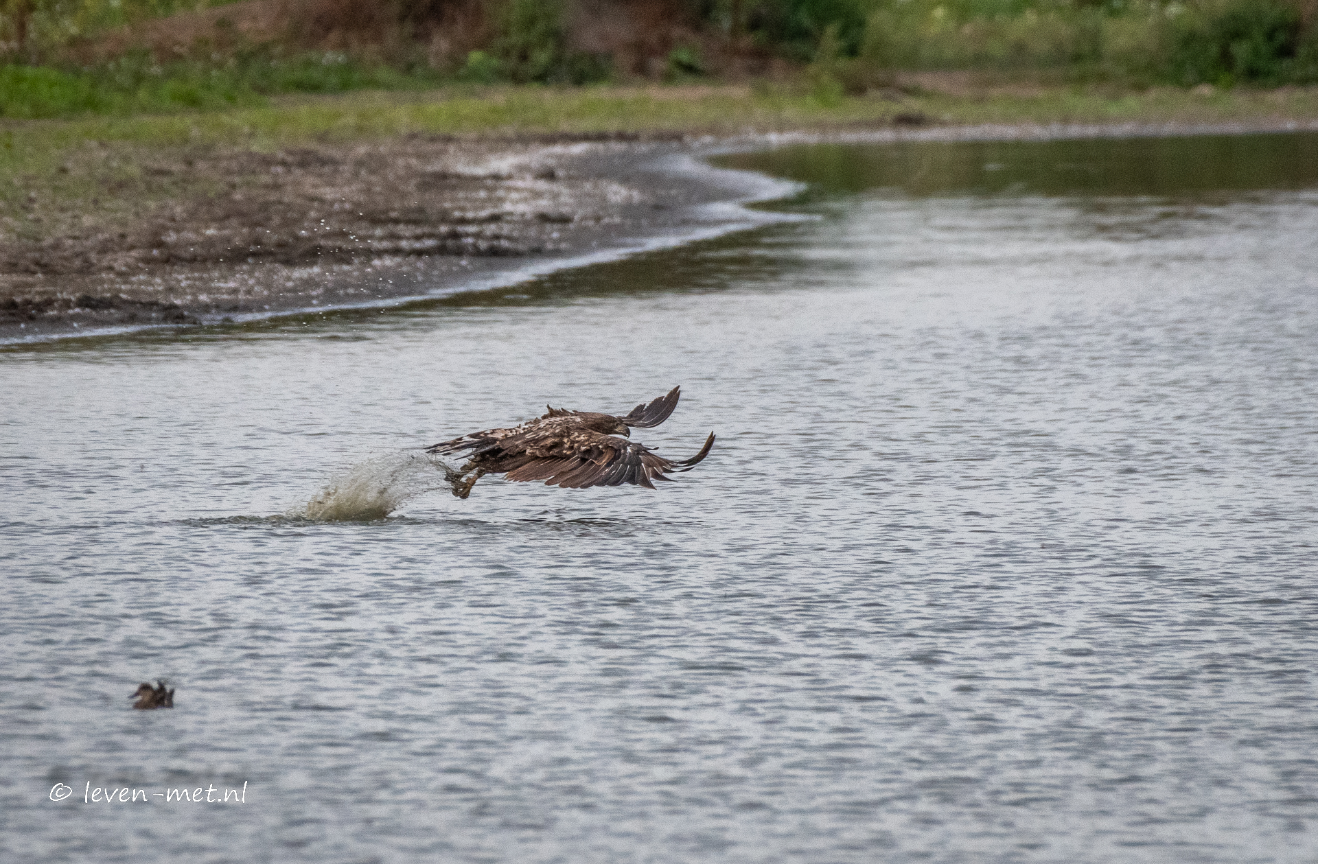 Daar heeft de zeearend op een gegeven moment genoeg van en gaat op de vleugels. Nu gaat de zeearend ons laten zien hoe hij een prooi vangt. Althans dat probeert hij te laten zien. Aangezien het eindresultaat nul is. Dat betekend dat de zeearend met legen poten thuis komt.