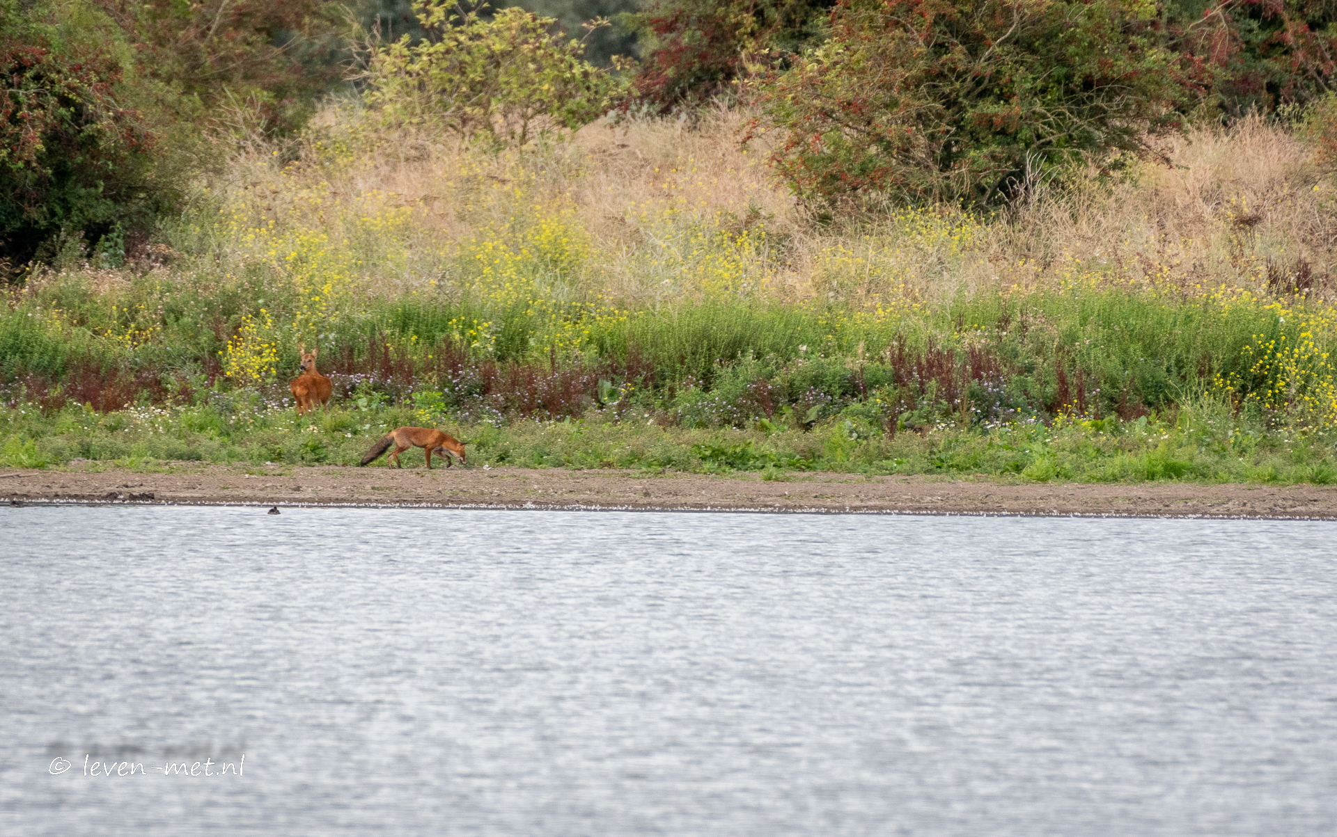 Maar eerst worden we even afgeleid door een vos die ook nog langs een ree loopt.