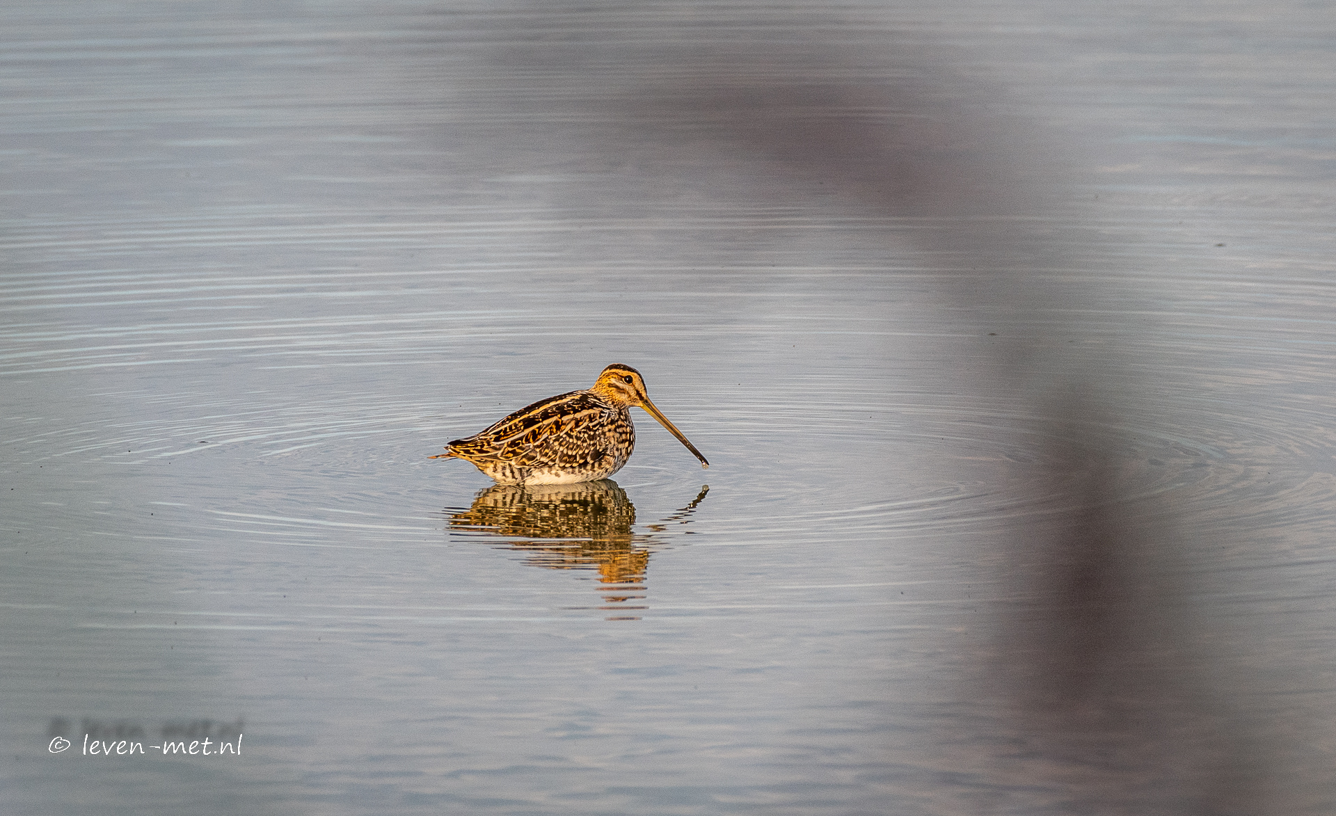 De watersnip laat zich ook even goed zien en zit een klein beetje in het eerste zon licht.