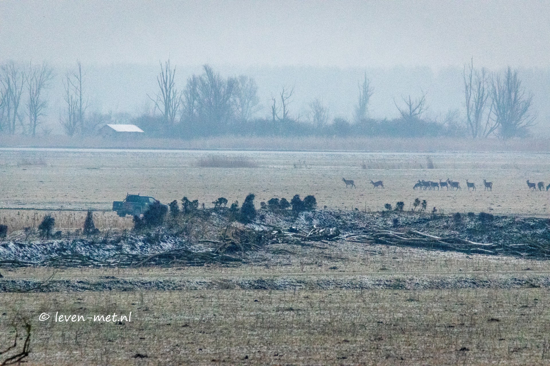 En dat valt niet mee op deze koude erg koude en grijze ochtend. De ISO’s schieten weer om mijn oren. Maar ze staan er weer op ik draai nu de praamweg op en stop nog even bij de grote Praambult. De Edelherten staan weer ver op de vlakte maar ze staan er weer mooi op. Ook de boswachter is al weer zijn ronde aan het maken.