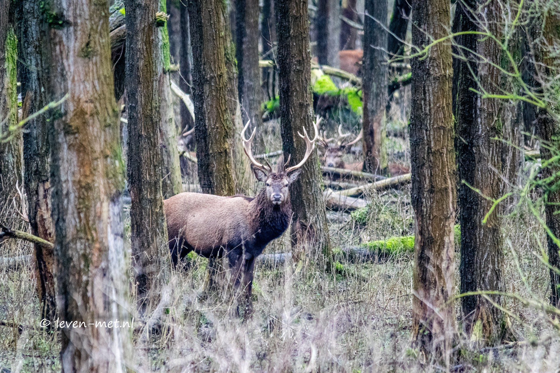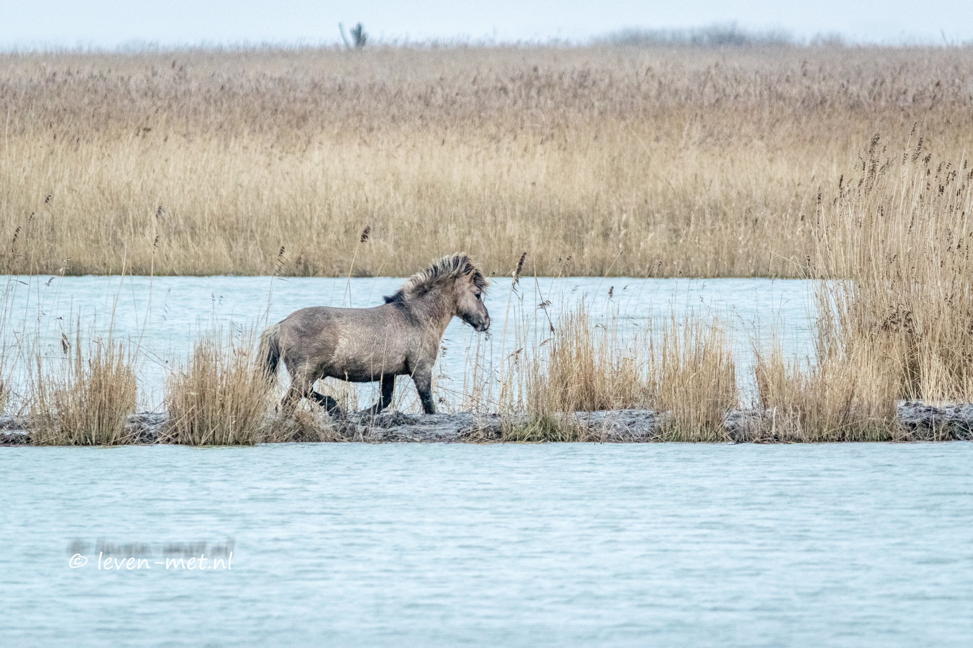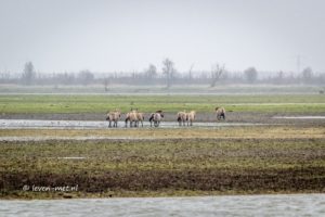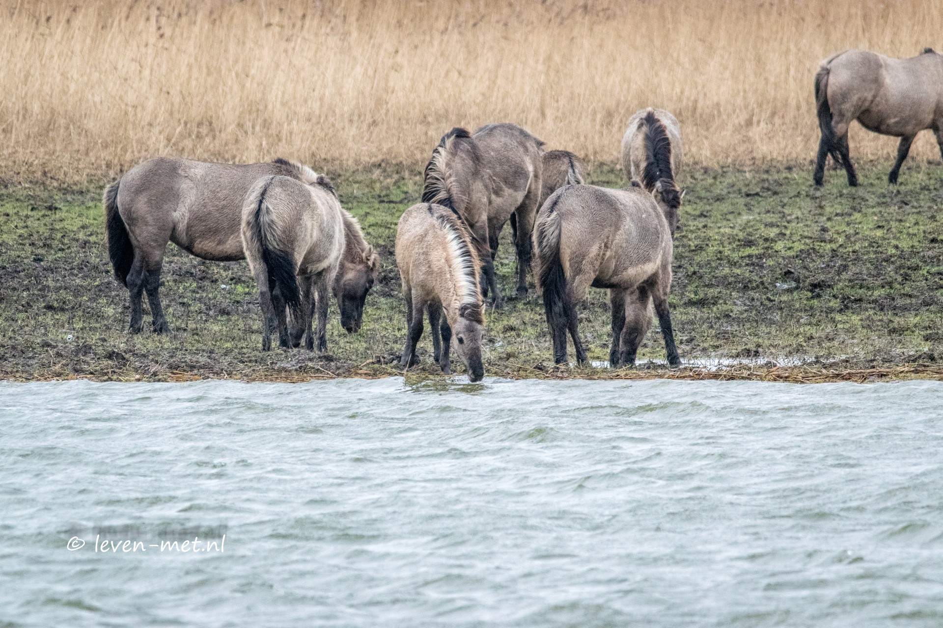Op de vlakte loopt een groepje edelherten. En niet veel later komt er een groepje konikpaarden uit het riet zetten. Om langs de waterkant even wat te drinken. Een ding is zeker door de hevige regenval en sneeuwval van de afgelopen weken staat het water erg hoog. Ik heb het de afgelopen twee jaar nog niet zo hoog zien staan. En zeker niet zo nat als nu. Je merkt het overall waar de grote grazers zijn dat de grond echt verzadigd is met water. Ze moeten door de blubber banjeren om ergens te komen. De omstandigheden zijn heel zwaar, ik verwacht dat het een hele zware winter periode gaat worden voor de grote grazers. En verwacht dat veel beesten het niet zullen halen tot aan het voorjaar.